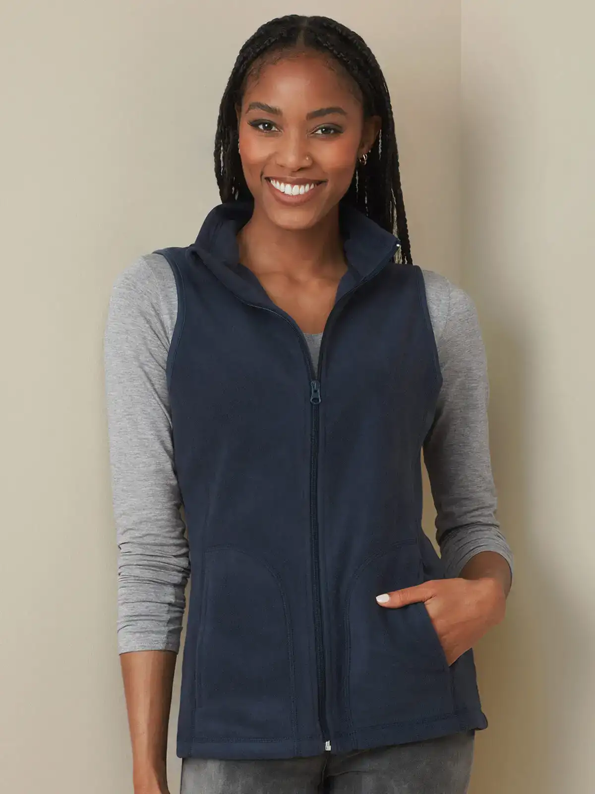 100% poliestere (anti-pilling). Pile anti-pilling micro-fleece, smanicato, con zip intera tono su tono, struttura con cuciture laterali, due tasche frontali.