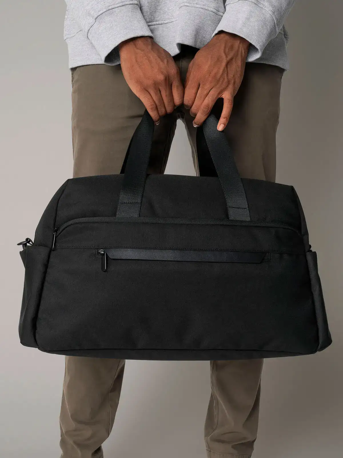 100% poliestere riciclato 600D. Borsone in stile minimalista, con manico, scomparto principale con zip, fodera interna con finitura premium, tre tasche portaoggetti all'interno dello scomparto principale, due grandi tasche a soffietto all'estremità, tasca posteriore con cerniera che funge da manicotto da far scorrere sulla maniglia della valigia, tasca frontale esterna con cerniera e patta antipioggia e tasche interne a scorrimento, tracolla regolabile staccabile. Etichetta removibile. Dimensioni: 40x30x20cm (adatto alla maggior parte delle compagnie aeree).