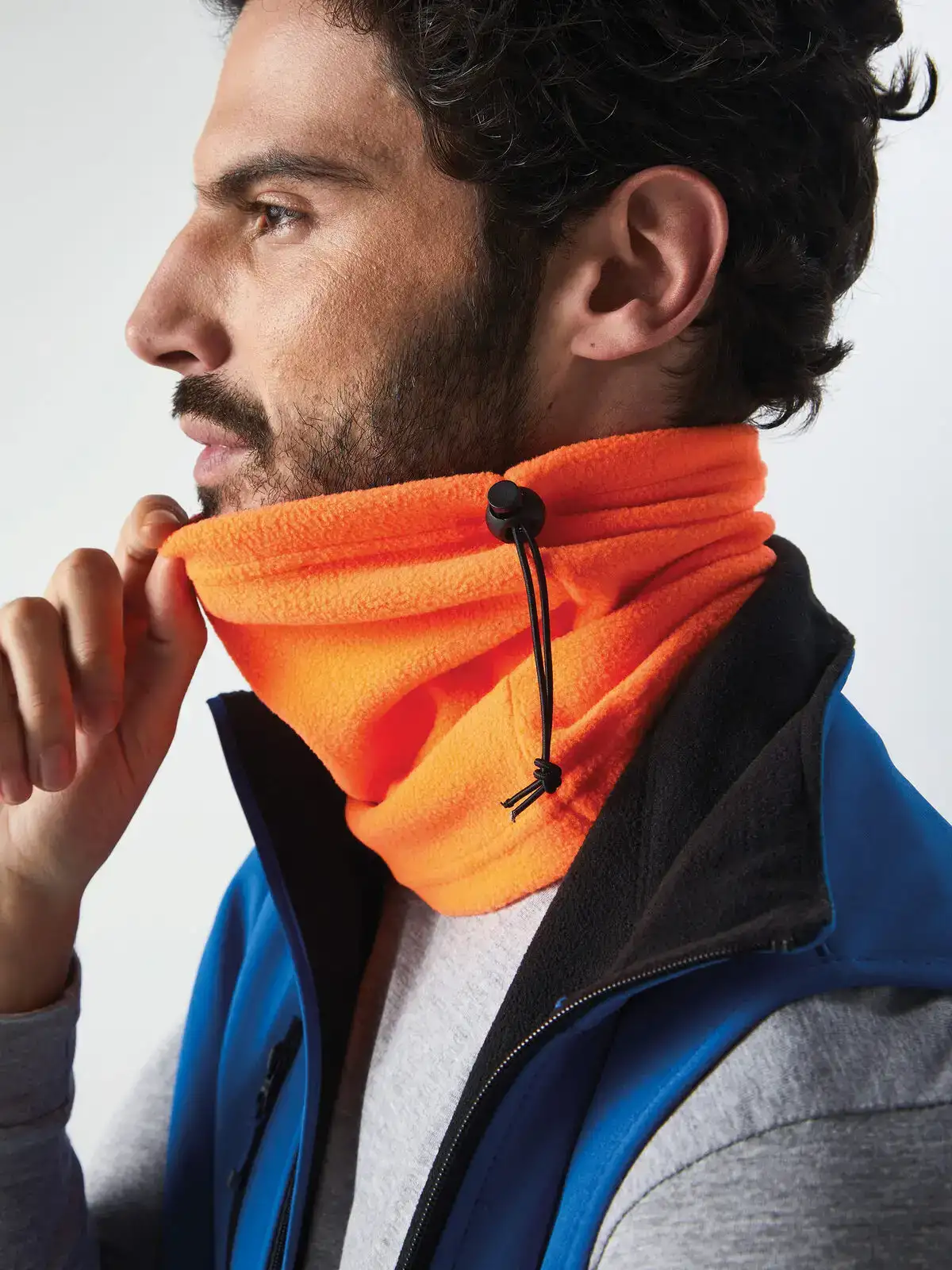 100% poliestere. Scaldacollo in tessuto ultra termico in pile, utilizzabile anche come berretto, dotato di cordoncino elastico con levetta.