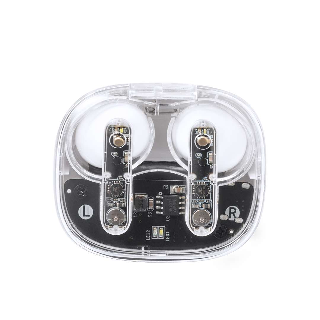 Cuffie intrauricolari dal caratteristico design trasparente. Connessione Bluetooth® 5.3 e lunga durata della batteria. Design ergonomico, con pulsante di controllo a sfioramento integrato nelle cuffie, base di ricarica abbinata e indicatori dello stato di carica. Funzione vivavoce. Porta di ricarica con ingresso Type-C (cavo incluso). Presentate in una scatola individuale dal design kraft e in un sacchetto riciclato.