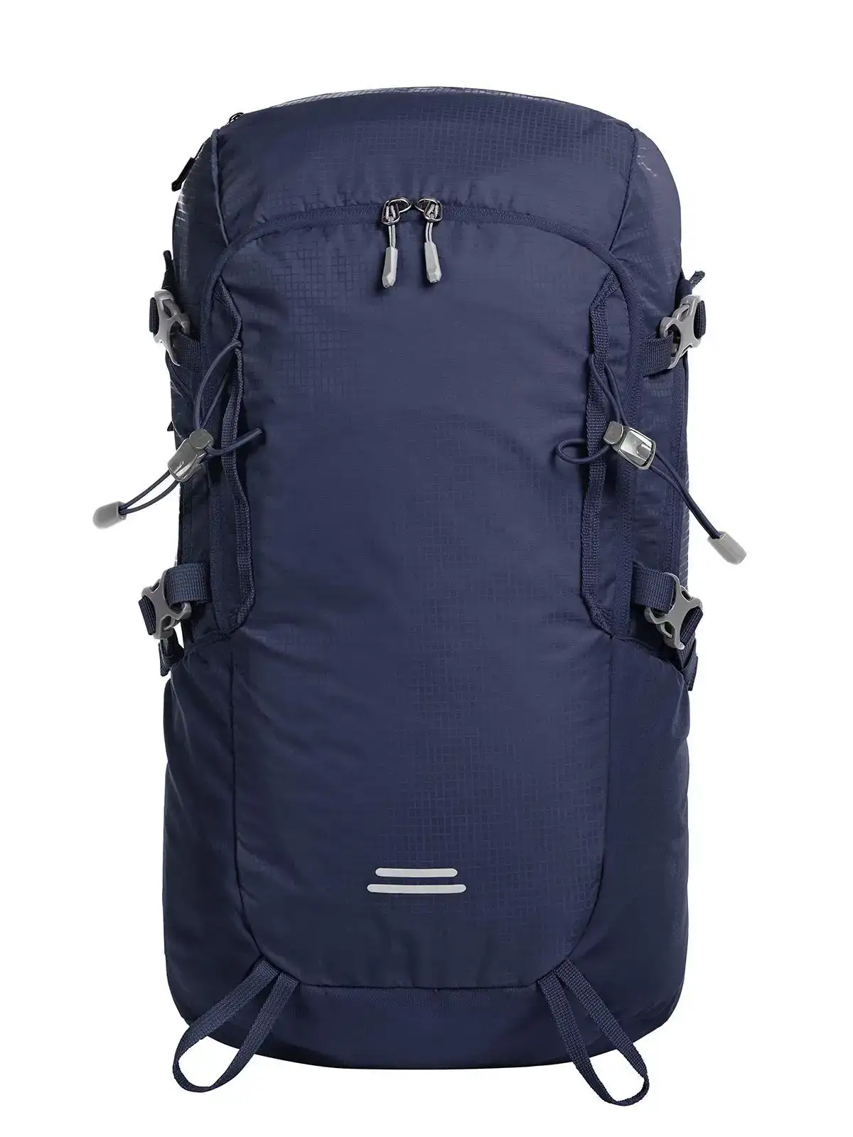 100% RPET 150D/600D Ripstop. Zaino leggero e funzionale, schienale imbottito con sistema a nido d'ape, regolabile in altezza. Cinturino al torace regolabile, cinturino addominale con tasche, scomparto principale con zip bidirezionale e tasca a inserto piatta, uscita posteriore per cuffie, diverse tasche fascia con cinghia Molle sulla tasca anteriore, stampa riflettente decorativa. Fissaggi per bastoni da trekking, tasca sul fondo con copertura antipioggia, manico.