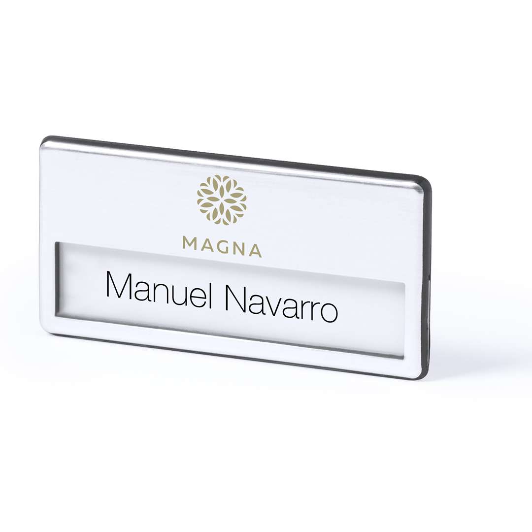 Badge portanome con finitura lucida. Dorso con doppio sistema di chiusura - clip metallica e spilla di sicurezza - per una vestibilità sicura.