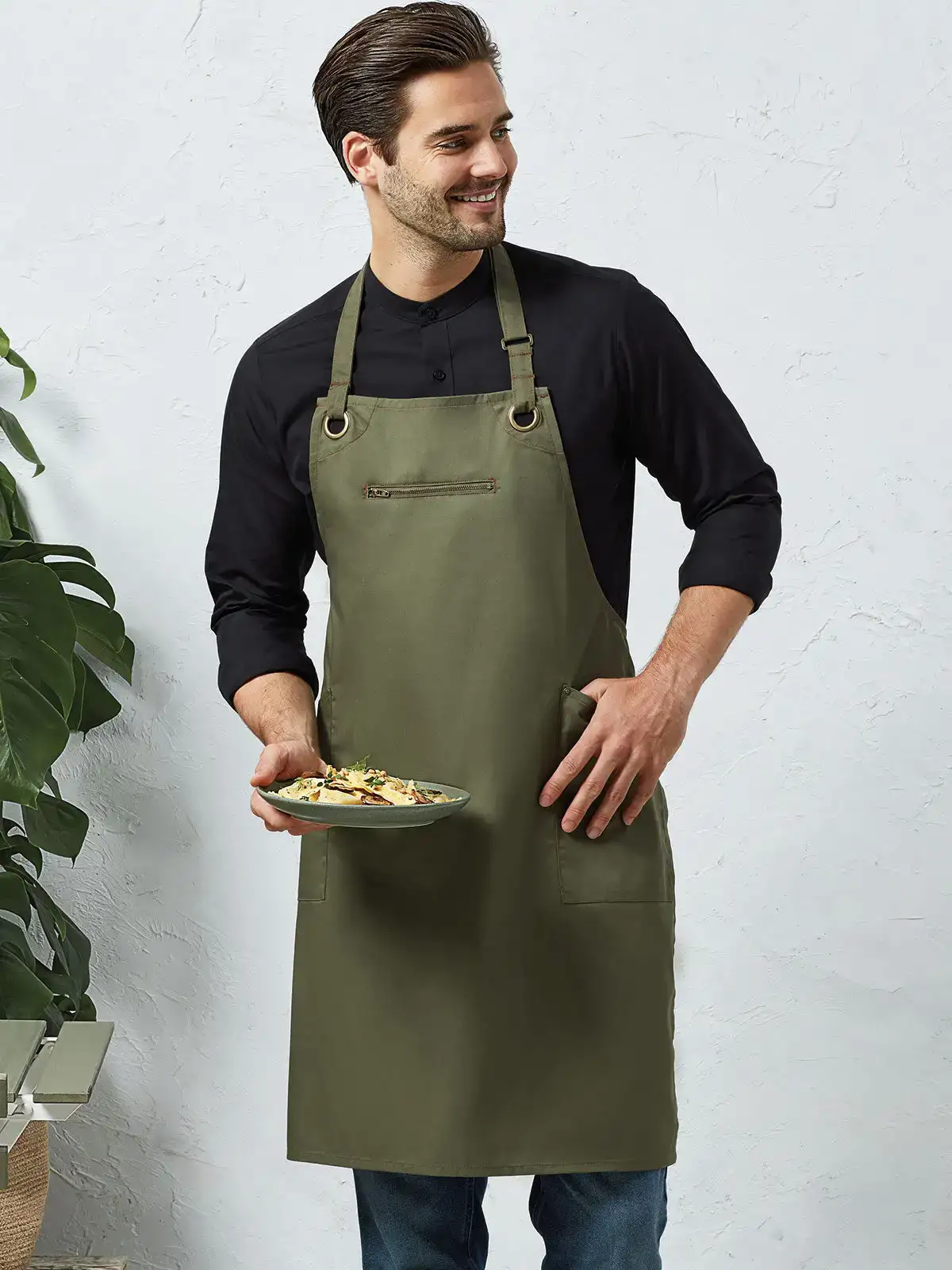 65% poliestere riciclato, 35% cotone. Grembiule con pettorina e cuciture a contrasto, 2 tasche laterali e una centrale sul petto con zip, laccio al collo regolabile con fibbia in metallo.