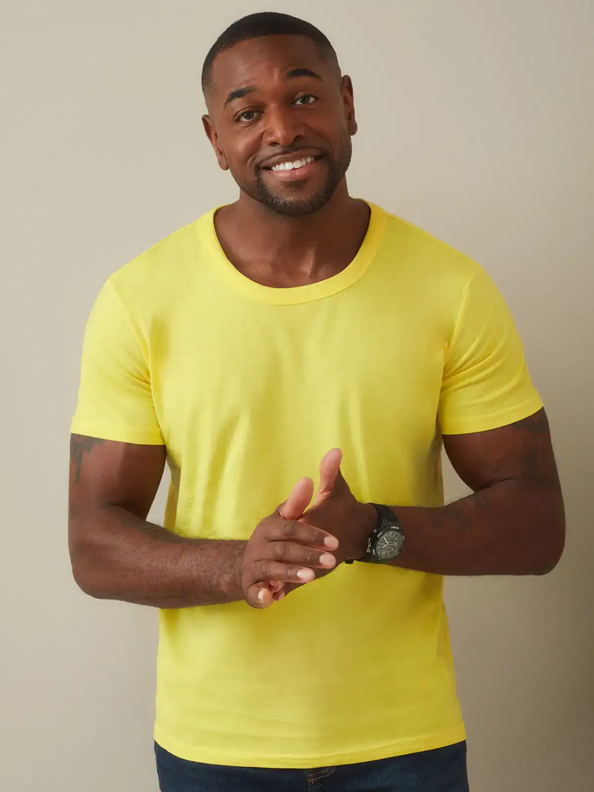 100% cotone ring-spun single jersey. T-shirt manica corta girocollo con bordo a costine orlato, struttura con cuciture laterali, etichetta strappabile, lavabile a 40°C. Col. GYH: 85% cot. 15% visc.