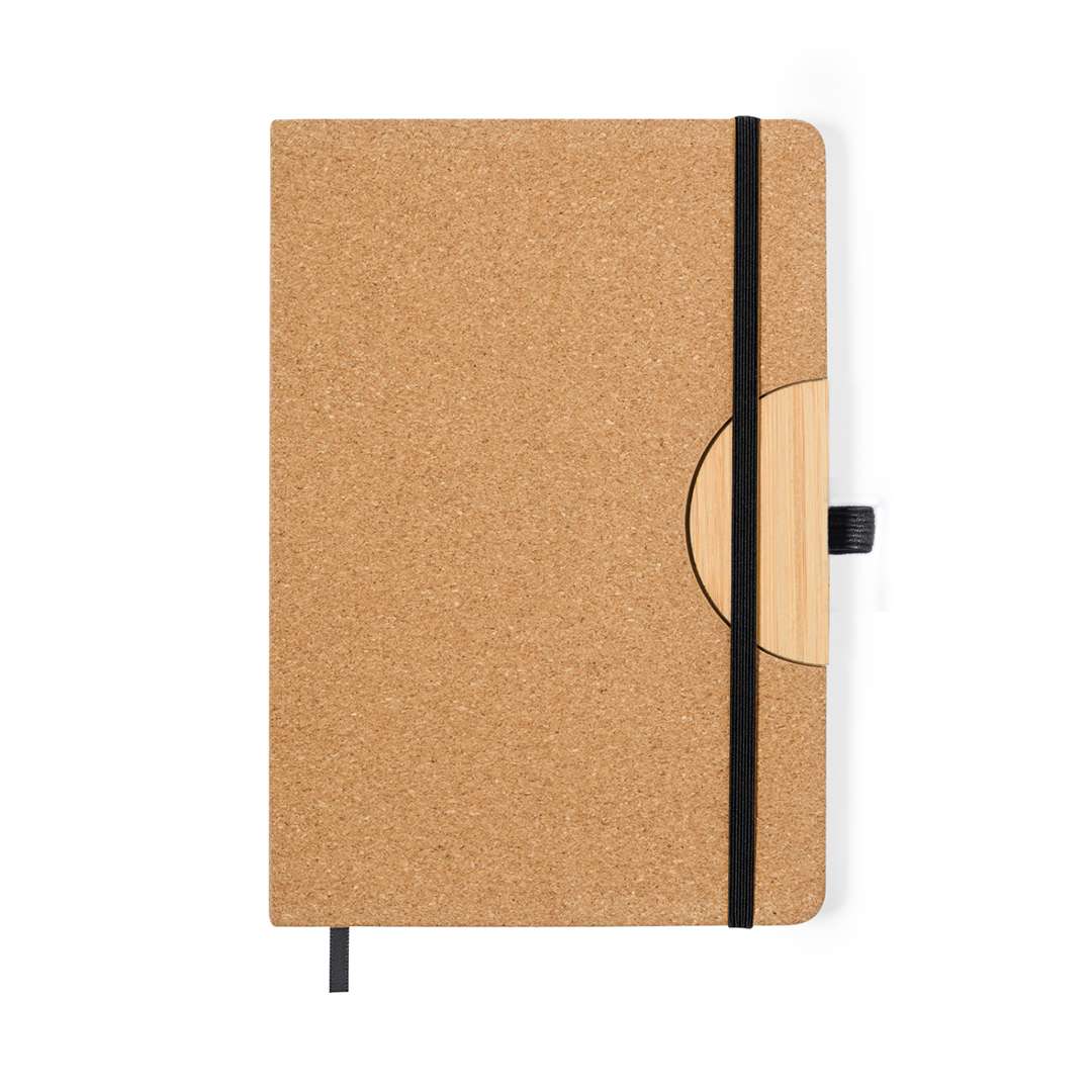 Taccuino supporto con copertina rigida in sughero, con versatile supporto integrato per smartphone e tablet in bambù. Presenta una chiusura elastica e un portapenne abbinato in nero. Contiene 100 pagine con layout a righe. Presentato in un sacchetto individuale riciclato.Realizzato con elementi di origine vegetale per promuovere l'uso di materie prime naturali e ridurre le emissioni inquinanti.