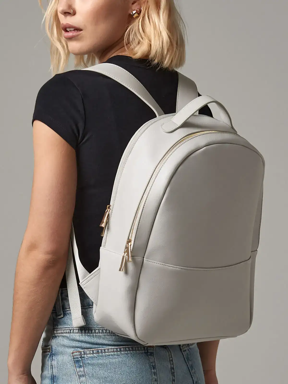 100% simil-pelle PU. Zainetto effetto saffiano, scomparto principale con zip. Tasca interna, portabottiglie interno, tasca separata sul pannello posteriore con cerniera, tasca interna con cerniera. Scomparto imbottito per laptop fino a 14". Fodera morbida, manico, cerniere in metallo dorato lucente, spallacci regolabili in tessuto. Etichetta removibile.