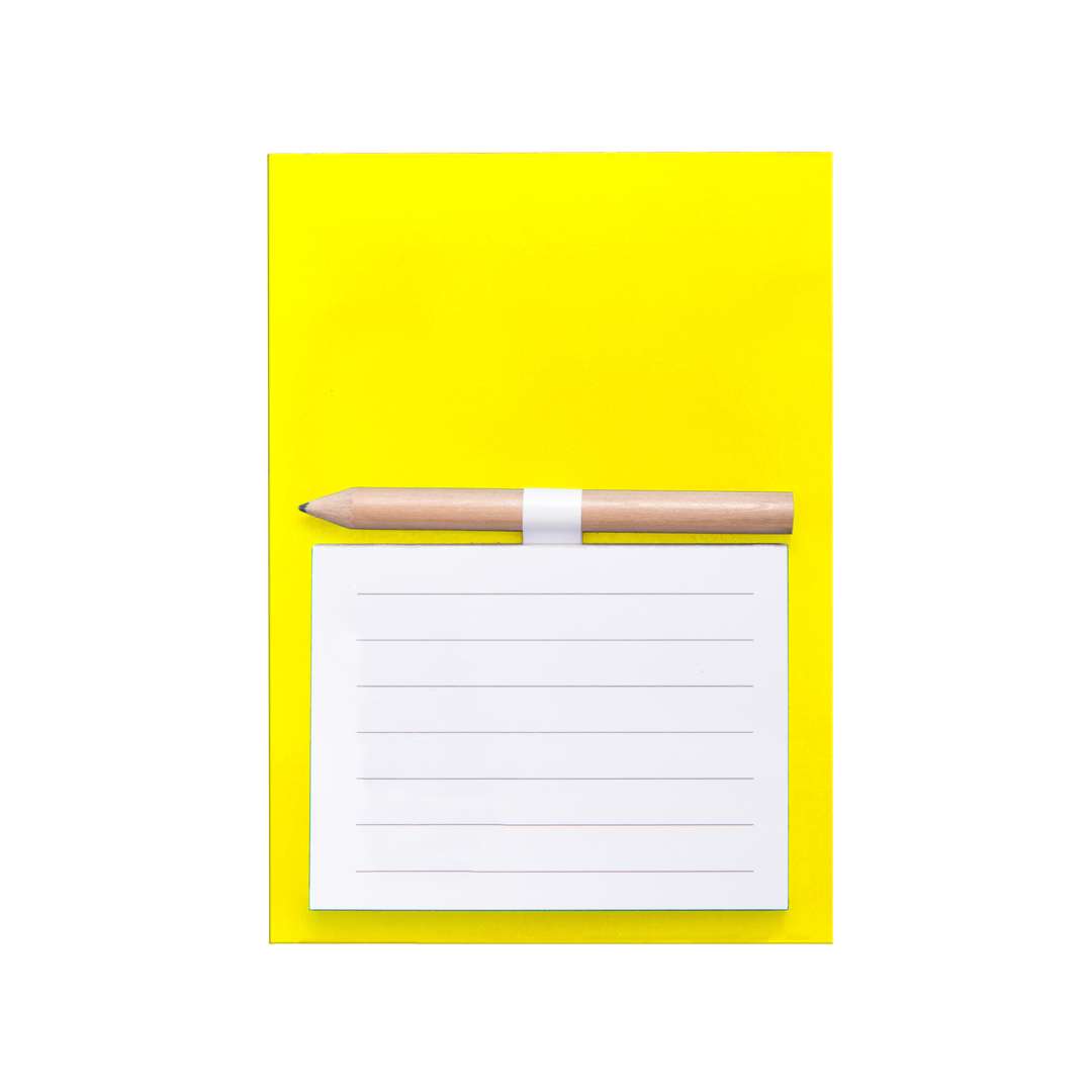 Calamita con block notes in robusto cartoncino in una varietà di colori vivaci. Blocco di 40 fogli con layout a una riga e porta mini matita incluso.