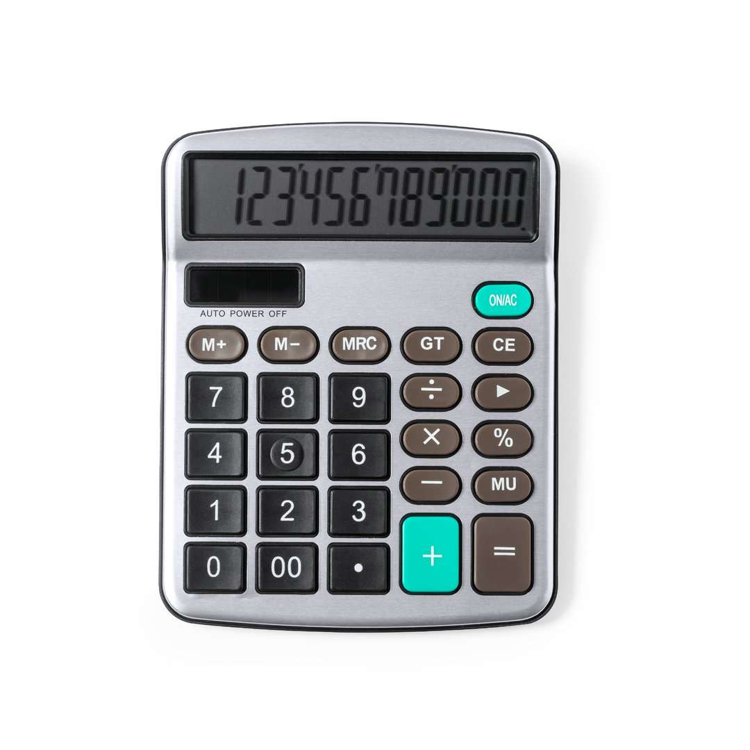 Calcolatrice a 12 cifre in robusto alluminio e ABS, con tasti soft-touch. Doppio funzionamento con alimentazione solare e alimentazione ausiliaria a bottone (inclusa, con pellicola protettiva). Display LCD e meccanismo di spegnimento automatico. Presentato in una scatola kraft individuale.