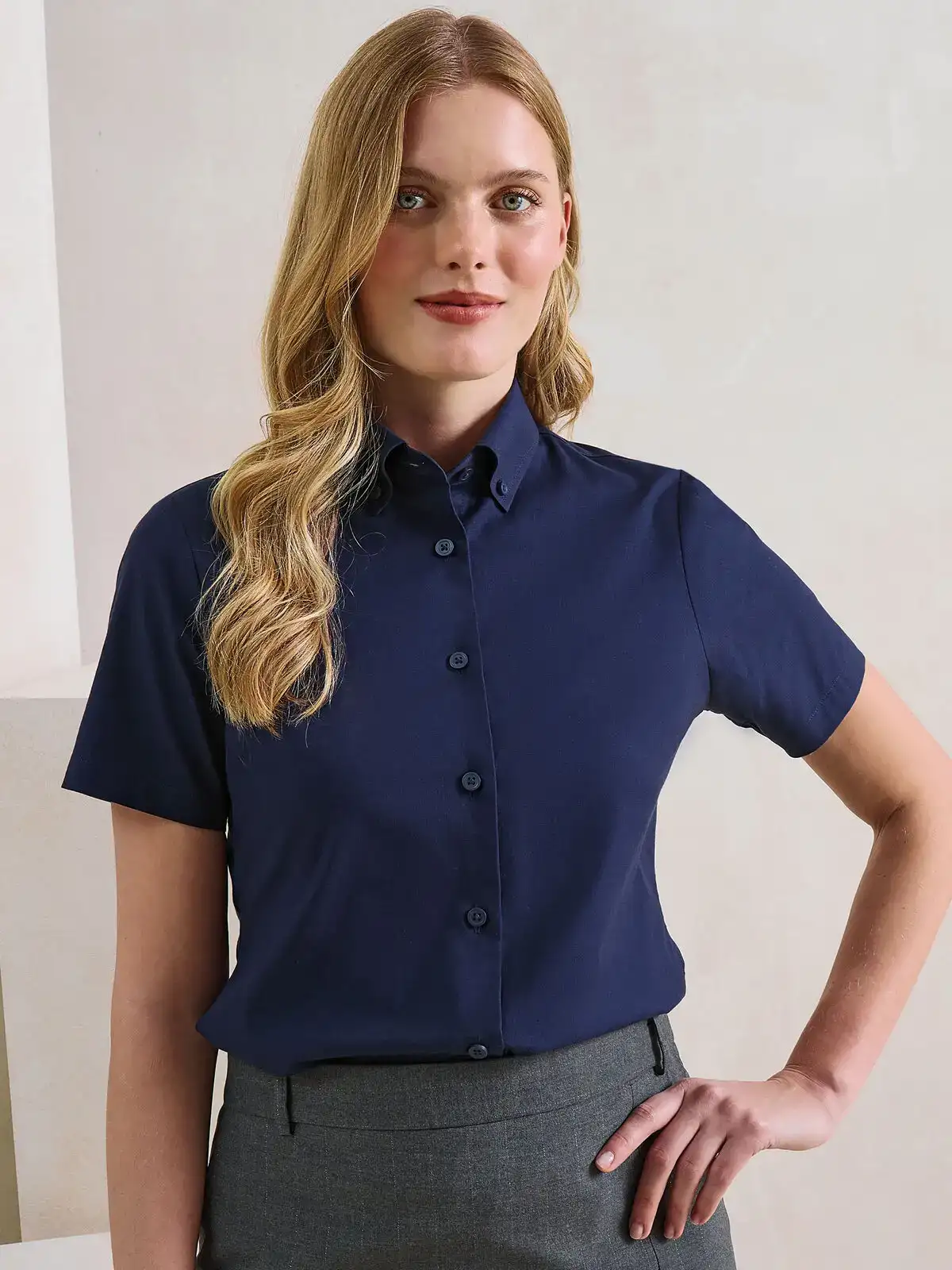72% cotone, 25% cotone organico, 3% elastan. Camicia da donna a maniche corte, colletto con bottoni, polsino con doppio bottone. Bottoni tono su tono. Freccette posteriori da donna.