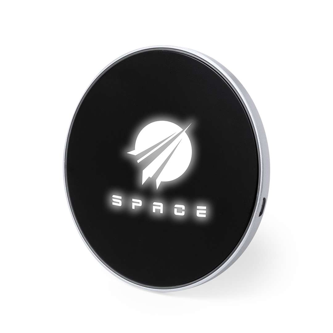 Caricatore wireless circolare. In un elegante colore nero, con luce interna a led e un rivestimento esterno appositamente progettato per la stampa laser, con il quale la vostra pubblicità o il vostro marchio saranno illuminati con luce bianca. Base antiscivolo e compatibile con i dispositivi dotati di tecnologia di ricarica wireless. Presentato in un'attraente scatola di design. Cavo USB incluso.