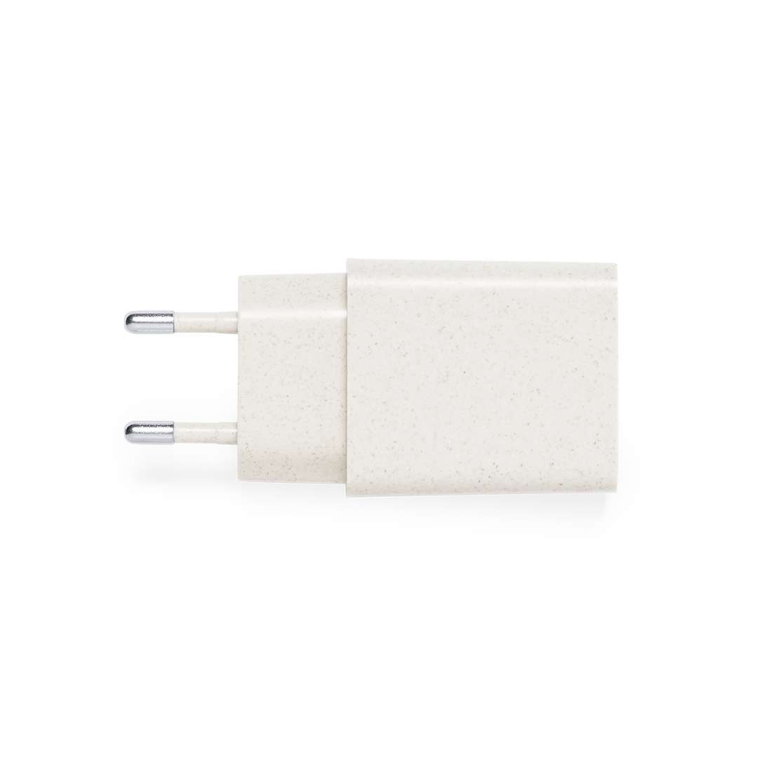 Caricatore da parete USB con ricarica rapida, realizzato in fibra di grano. Uscita USB e Type-C. Spina europea e presentato in un'attraente scatola individuale dal design kraft. La fibra di grano promuove l'uso di materie prime naturali, riducendo così le emissioni inquinanti.