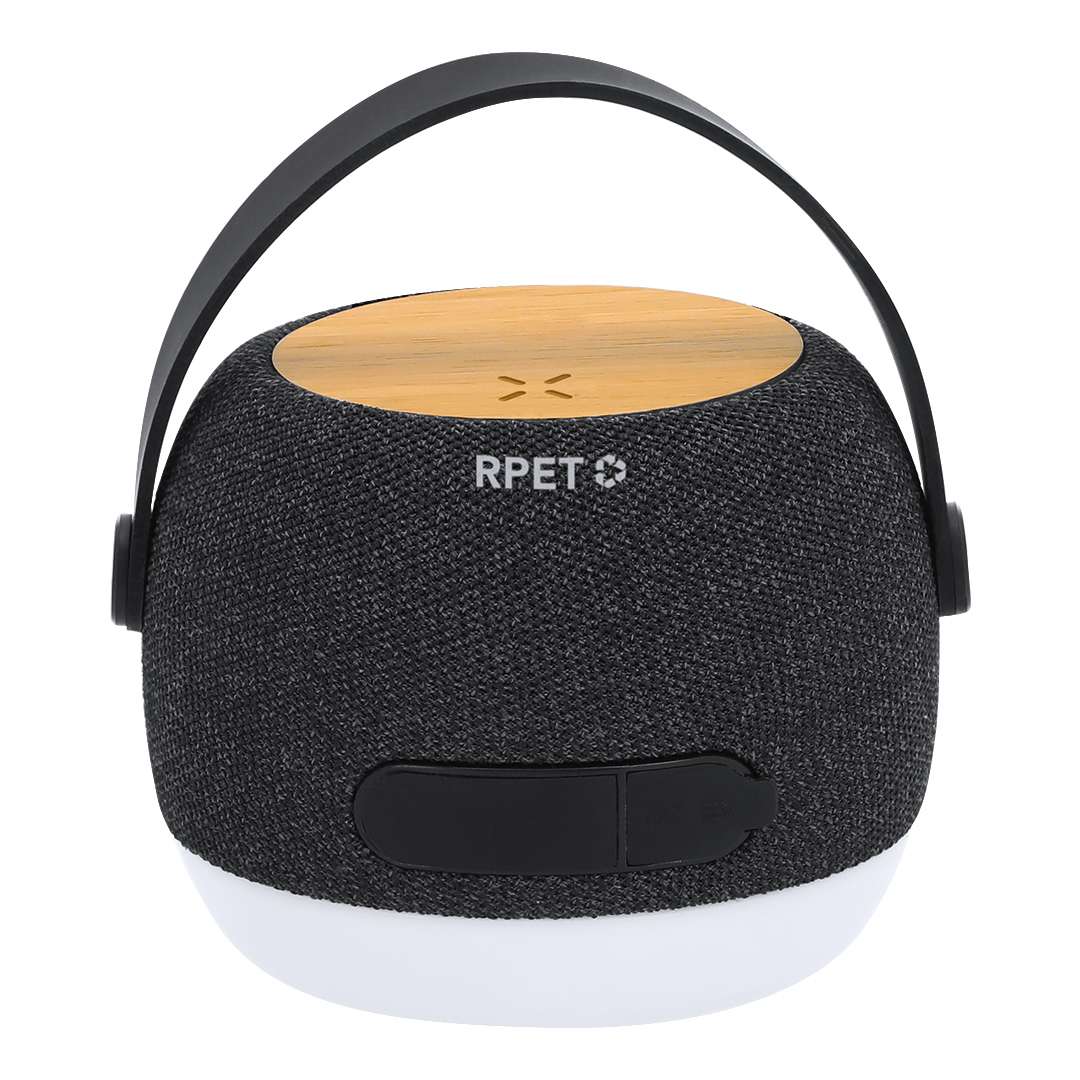 Altoparlante Bluetooth® con caricatore e ricarica wireless da 15W, realizzato in RPET e bambù. Dispone di un sistema di illuminazione con 12 LED che si sincronizzano con il ritmo della tua musica, creando atmosfere vibranti. Include una morbida e pratica maniglia in silicone per un facile trasporto e il logo RPET.Il materiale RPET è realizzato con plastica riciclata, promuovendo così il riutilizzo dei rifiuti plastici e contribuendo alla sostenibilità del pianeta.Materiali come il bambù promuovono l'uso di materie prime naturali, riducendo così le emissioni inquinanti. Proviene da una pianta altamente resistente e versatile, con una rapida crescita e rigenerazione, rendendola un'ottima alternativa all'uso del legno tradizionale.