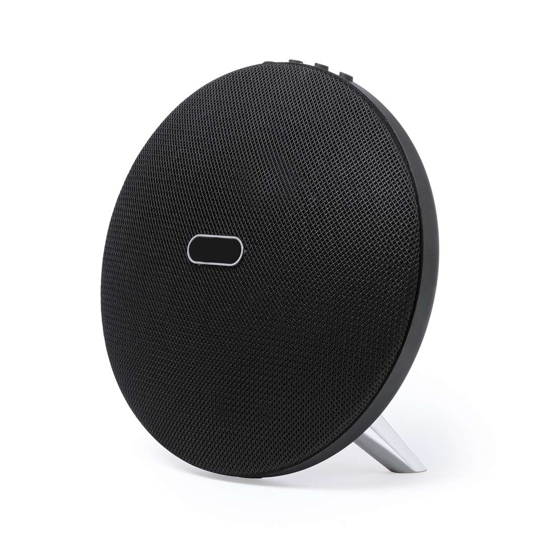 Altoparlante con connessione Bluetooth® dall'elegante finitura nera con accessori argentati e dall'originale design circolare. Offre una potenza di 8W, ha la funzione vivavoce, uno slot per schede micro SD fino a 32 GB di capacità e ingresso di linea ausiliario tramite connessione jack da 3,5 mm. Compatibile con iOS e Android, include un cavo di ricarica mini USB e un cavo jack ausiliario da 3,5 mm ed è confezionato in un'attraente scatola di design. Con piedini in gomma antiscivolo sulla base.