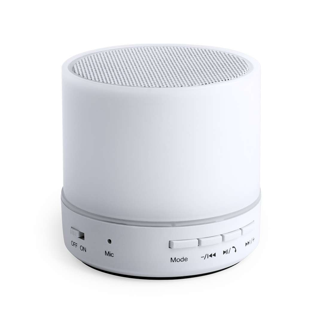 Altoparlante con tecnologia Smart LED e connessione Bluetooth®. Potenza di 3W, con slot USB per la riproduzione di musica da unità esterna e funzione vivavoce. Slot per schede micro SD fino a 32 GB di capacità, ingresso linea ausiliaria tramite connessione jack da 3,5 mm e base antiscivolo. Radio FM, con luce multicolore, ricaricabile tramite cavo USB -incluso- e presentato in una scatola dal design accattivante.