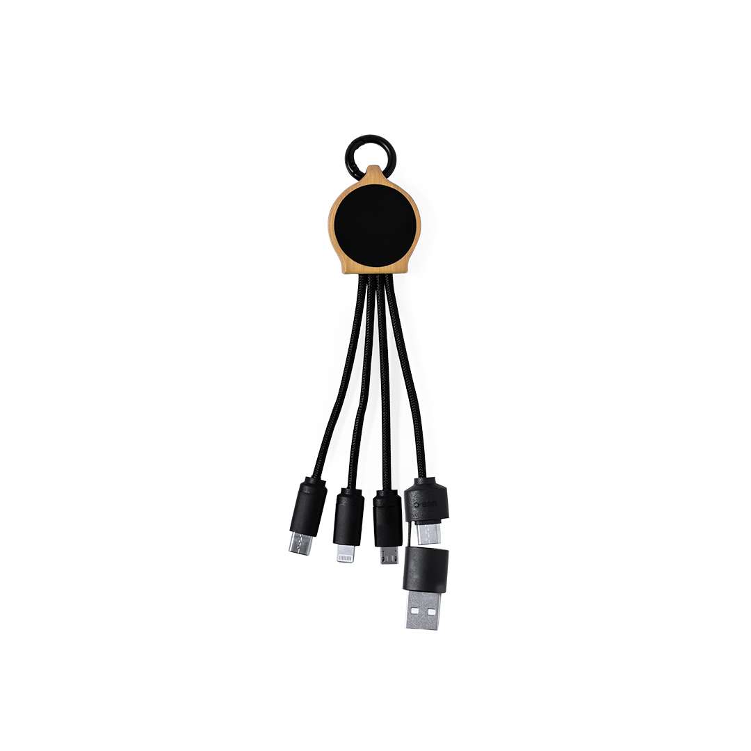 Cavo di ricarica realizzato in bambù e superficie in elegante nero, con luce LED interna e un rivestimento esterno appositamente progettato per la stampa laser, illuminando così il logo. Con connessioni di ingresso di tipo C e USB e uscite di tipo C, Lightning e Micro USB. 5V DC 2,4A. Presentato in un sacchetto di design kraft individuale.