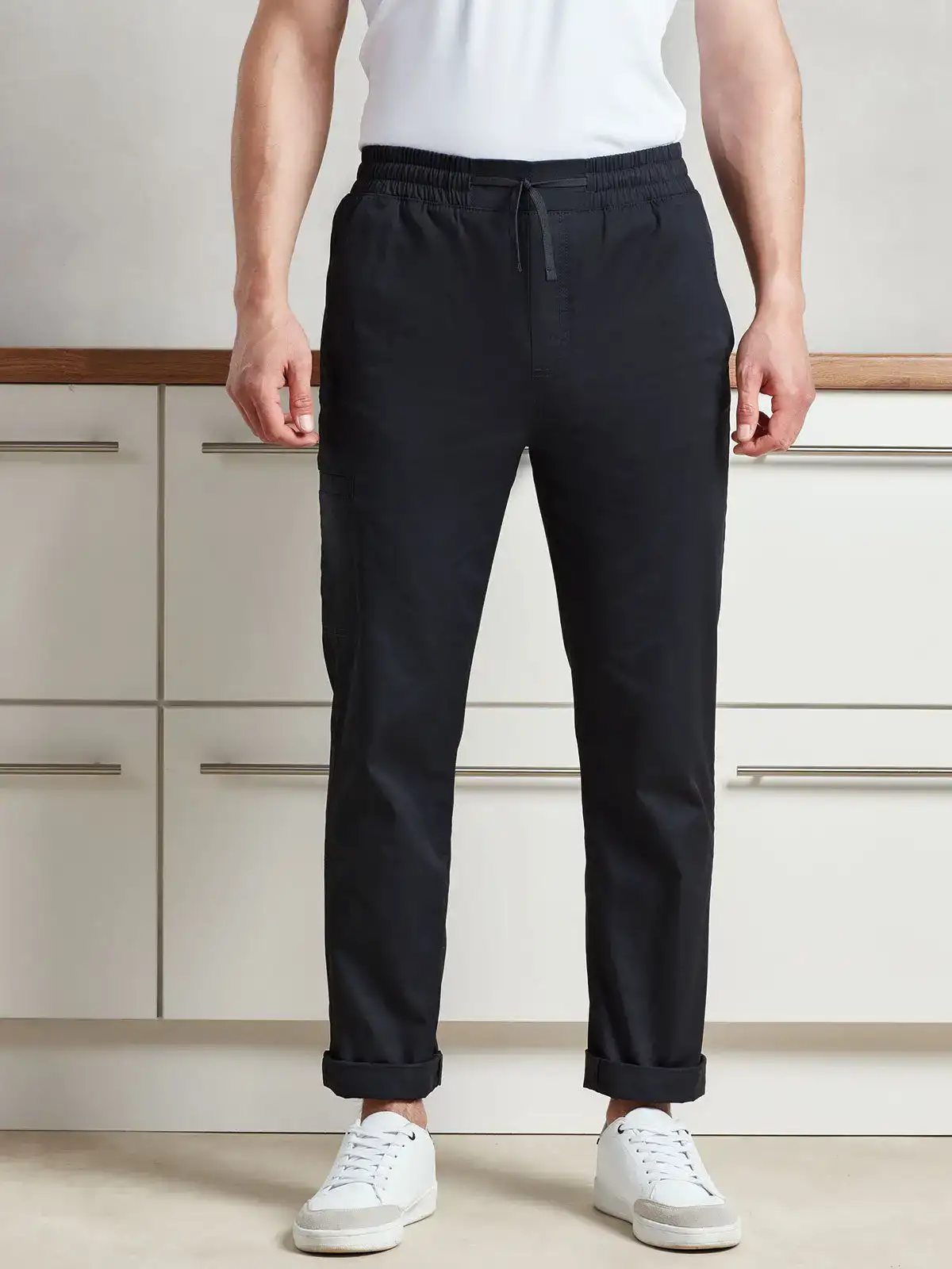 65% poliestere riciclato, 35% cotone. Pantaloni cargo da chef in tessuto policotone riciclato, con vita