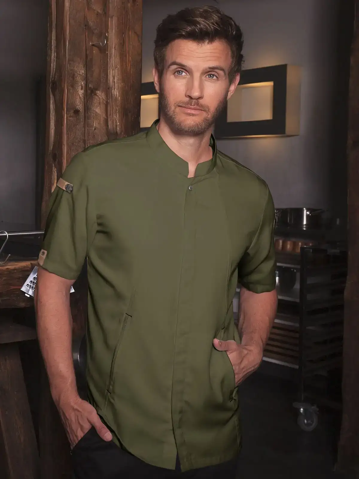 Lato anteriore: 65% cotone organico, 35% poliestere riciclato, Lato posteriore: 100% poliestere riciclato. Lato anteriore 150 g/m², Lato posteriore 150 g/m². Giacca da cuoco sostenibile, traspirante, con regolazione dell'umidità, maniche corte. Taglio moderno (leggermente aderente), inserto posteriore in Jersey Piqué per una maggior ventilazione e libertà di movimento, bottoni automatici, polsini con apertura. Lato anteriore con tasche con zip e tasca a filetto sulla manica sinistra, nastri a contrasto su maniche e collo. Lavabile a 60°C.