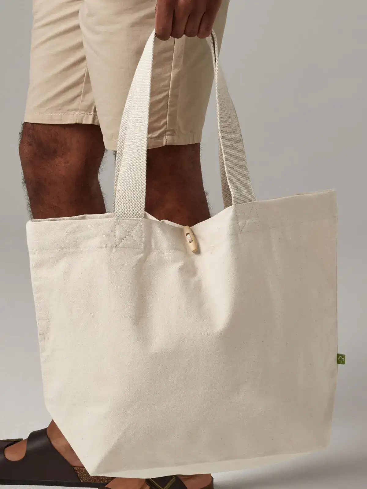 100% cotone organico canvas. Shopper in tessuto pesante premium, chiusura con alamaro, manici in cotone. Etichetta removibile. Lunghezza manico - 60 cm. Dimensioni: 34x34x17 cm, capacità: 20L, area di stampa: 46x20 cm.