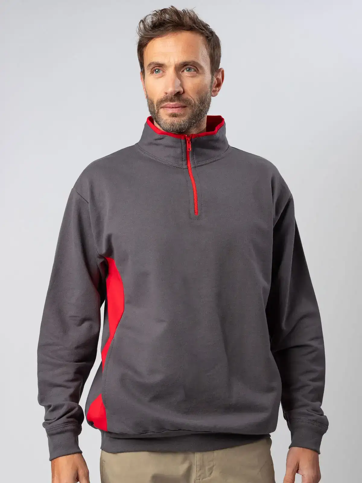 100% cotone. French terry. Felpa mezza zip bicolore parte interna del collo, fianchi, interno tasca e cerniera di colore contrastante. Struttura con cuciture laterali, maniche set-in.