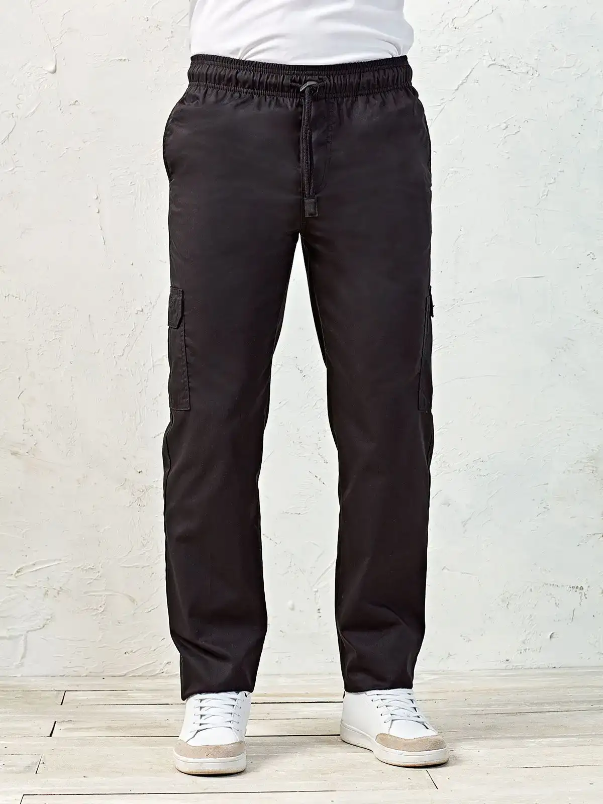 65% poliestere, 35% cotone Twill. Pantaloni da cuoco con girovita elastico e regolazione con coulisse. Tasca posteriore singola con chiusura a strappo, due tasche per il telefono.