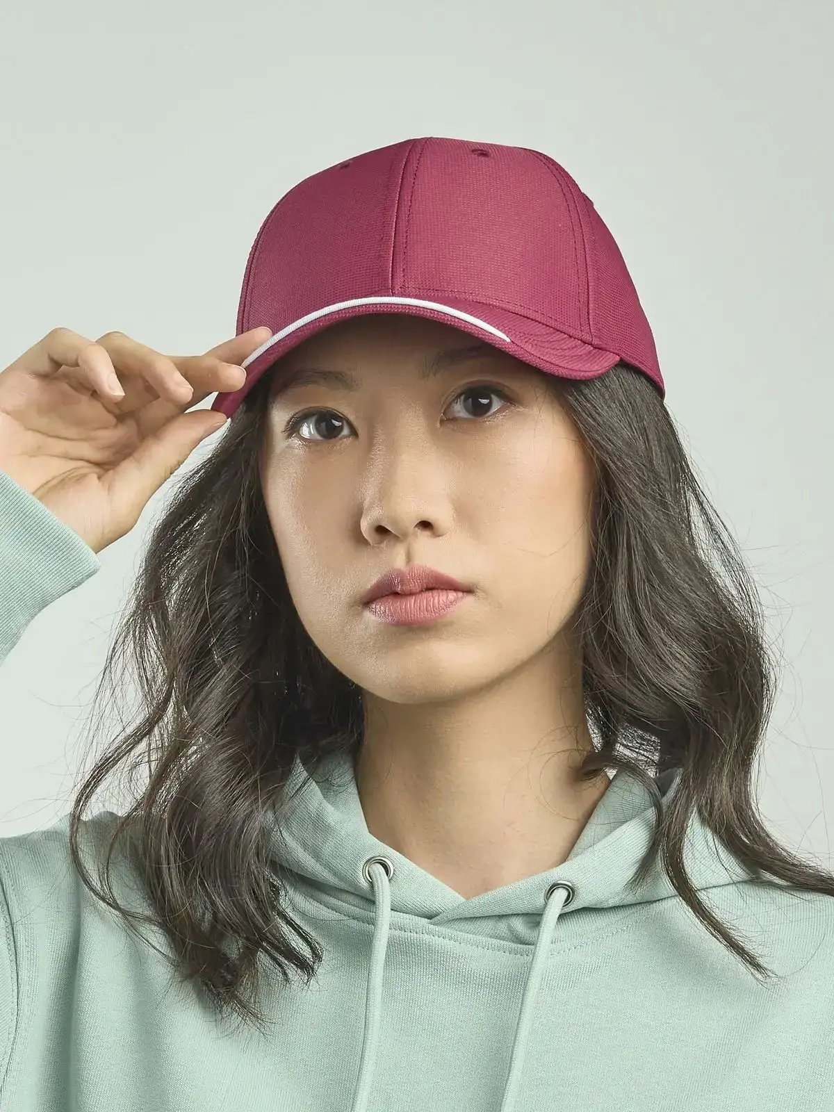 100% poliestere. Cappellino a 6 pannelli, occhielli ricamati, pannello frontale rinforzato, visiera pre-curvata, chiusura in velcro, 4 cuciture su visiera, parasudore in poliestere, piping in contrasto, etichetta removibile, taglia unica.