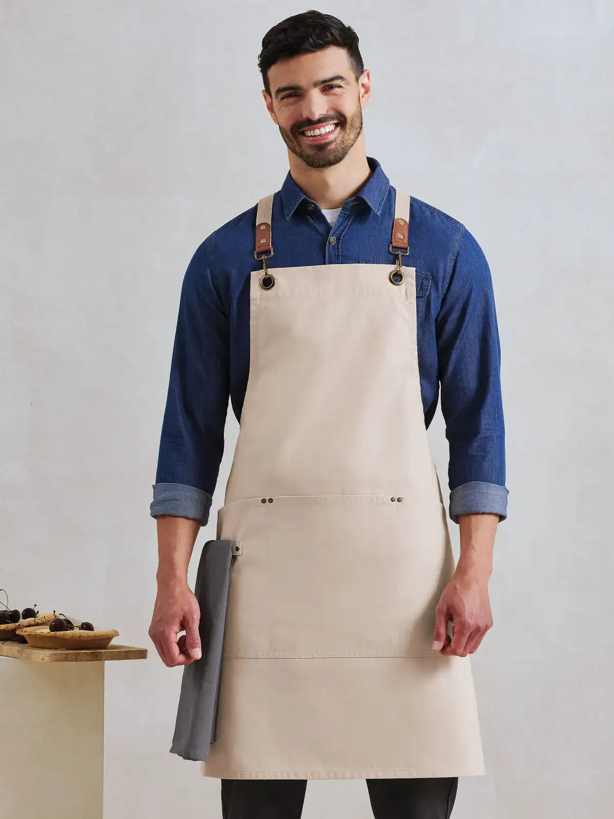 60% cotone, 40% poliestere riciclato. Grembiule con lacci incrociati sulla schiena, ganci a moschettone, dettaglio in finta pelle sul tessuto, tre grandi tasche a toppa, tasca per lo straccio dello stesso colore. Occhielli in ottone anticato.