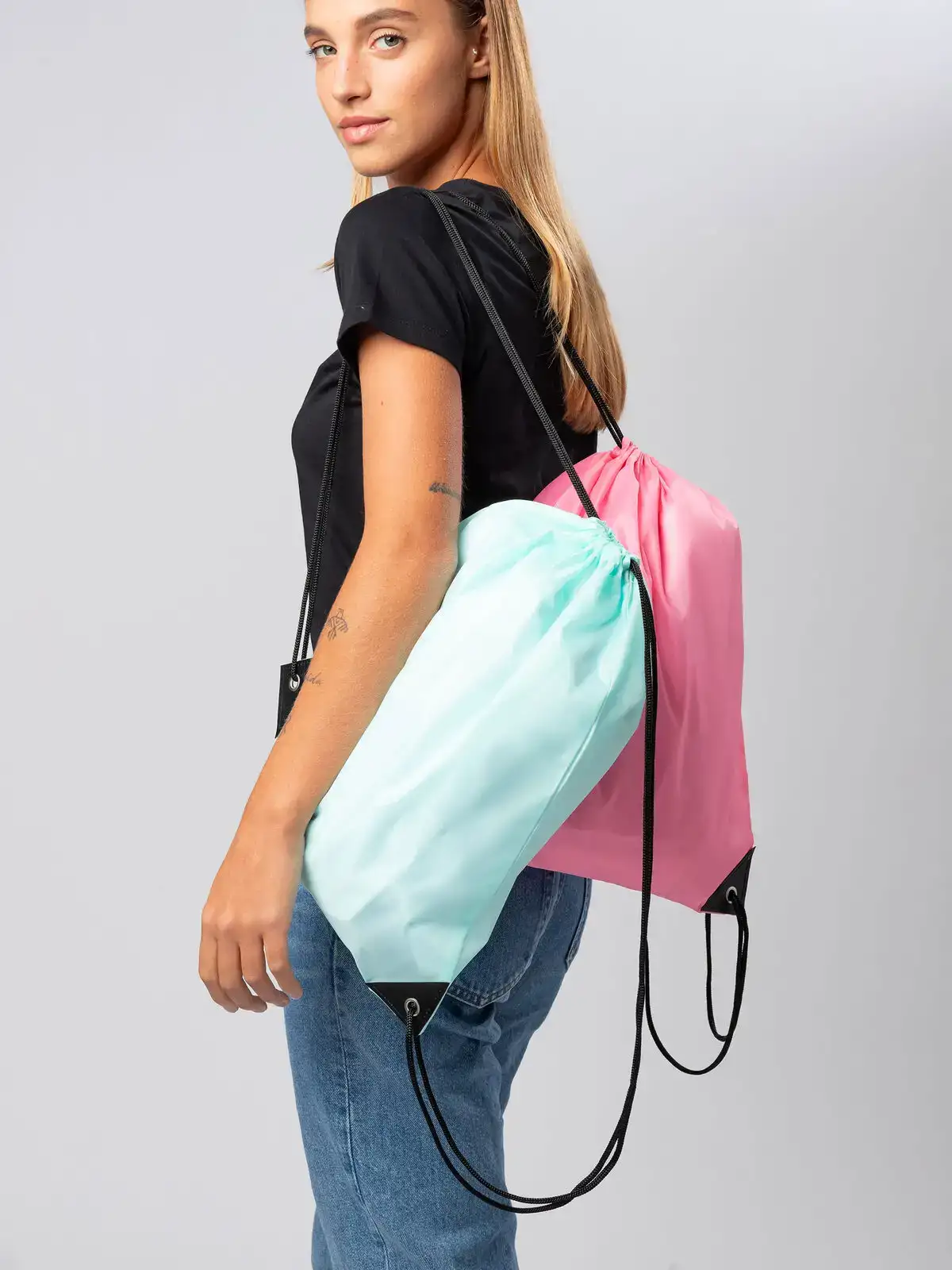 100% poliestere 210D. Pratica sacca da ginnastica con lacci resistenti. Compatta e leggera, ideale per trasportare con facilità accessori e oggetti personali. Dimensioni: 34 x 41 cm, perfette per garantire capienza e comodità.