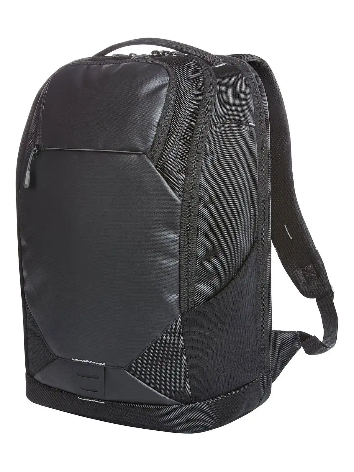 100% poliestere 1680d. Zaino con finitura riflettente, scomparto per notebook da 15"' tasca frontale con zip, due tasche a rete elastiche laterali, due tasche a inserto con zip nascoste, passante sul retro per il fissaggio al trolley, passaggio USB con cavo di collegamneto integrato. Area di stampa sulla tasca frontale: 12x16cm. Dimensioni: 33x48x18,5cm. Capacità: 24,5 litri.