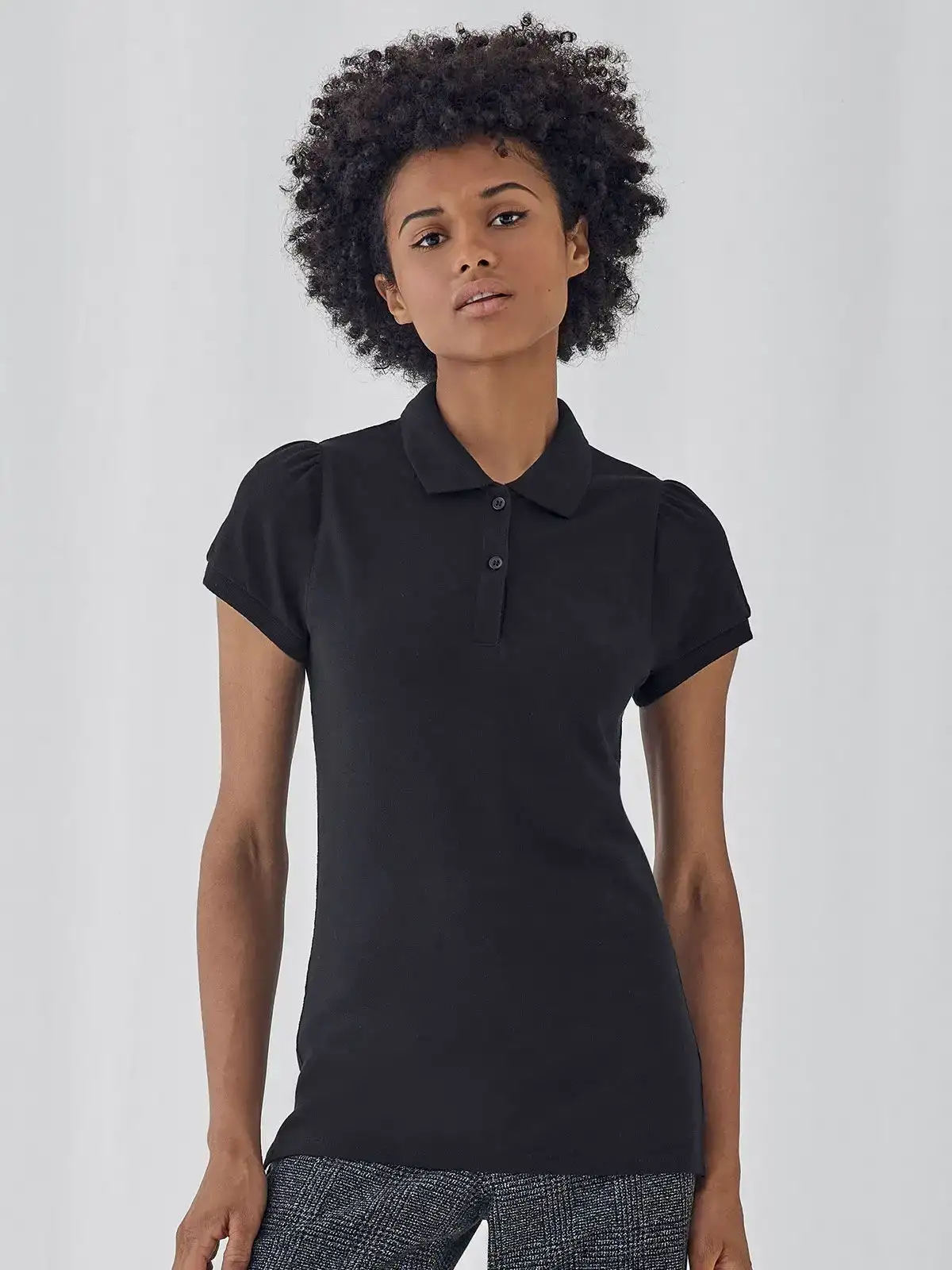 100% cotone ring-spun piqué. Polo a maniche corte set-in, arricciate per un taglio più femminile, struttura con cuciture e spacchetti laterali, 2 bottoni tono su tono. Leggermente sfiancata.