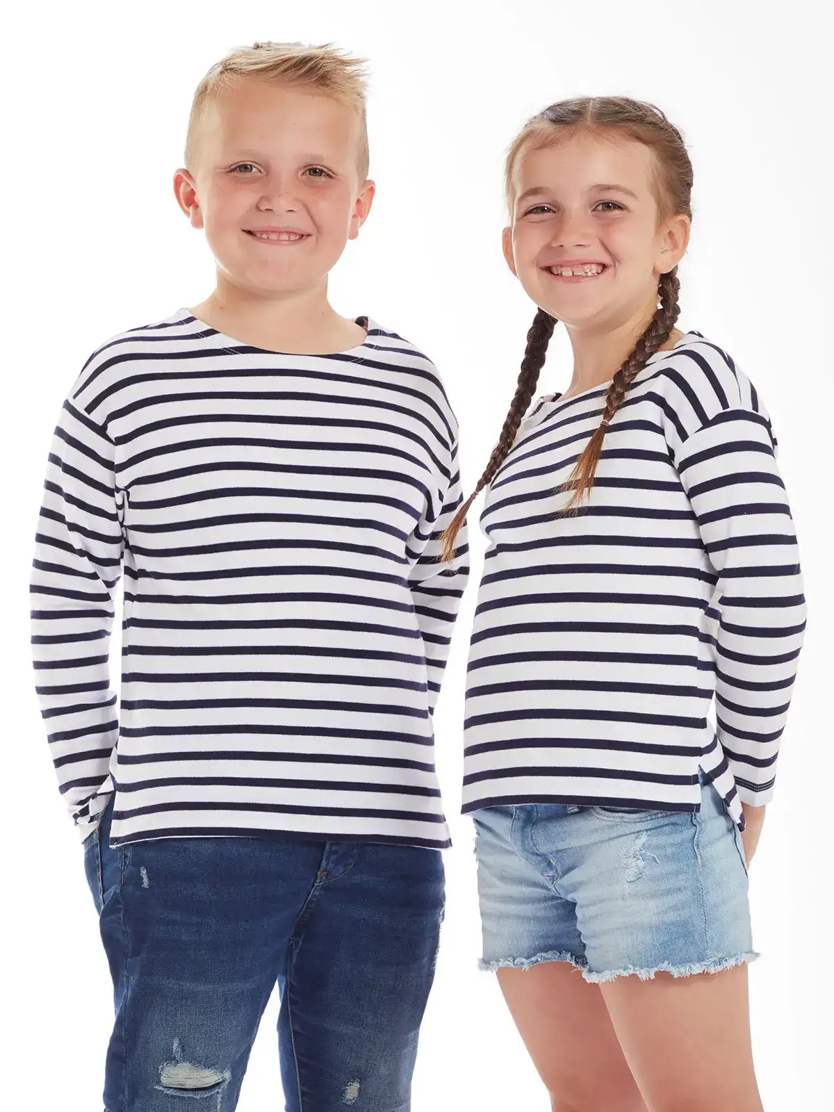 100% Cotone organico interlock. Maglia bambini maniche lunghe, spacchi laterali, più lunga sul retro, stampa a righe tinta in filo, etichetta strappabile.