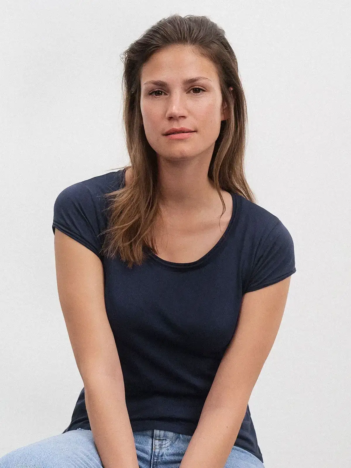 100% cotone organico single jersey. T-shirt con profondo girocollo, manica corta con orlo arrotolato, leggermente sfiancata. Etichetta strappabile, struttura con cuciture laterali.