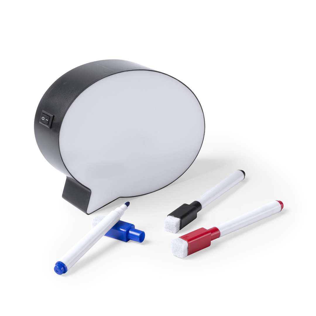 Divertente lavagna con interno illuminato da 8 LED. Con pulsante ON/OFF e tre pennarelli con cancellino nei colori blu, nero e rosso inclusi. Alimentazione a batteria: 3xAAA non incluse e confezionata in una scatola dal design accattivante.