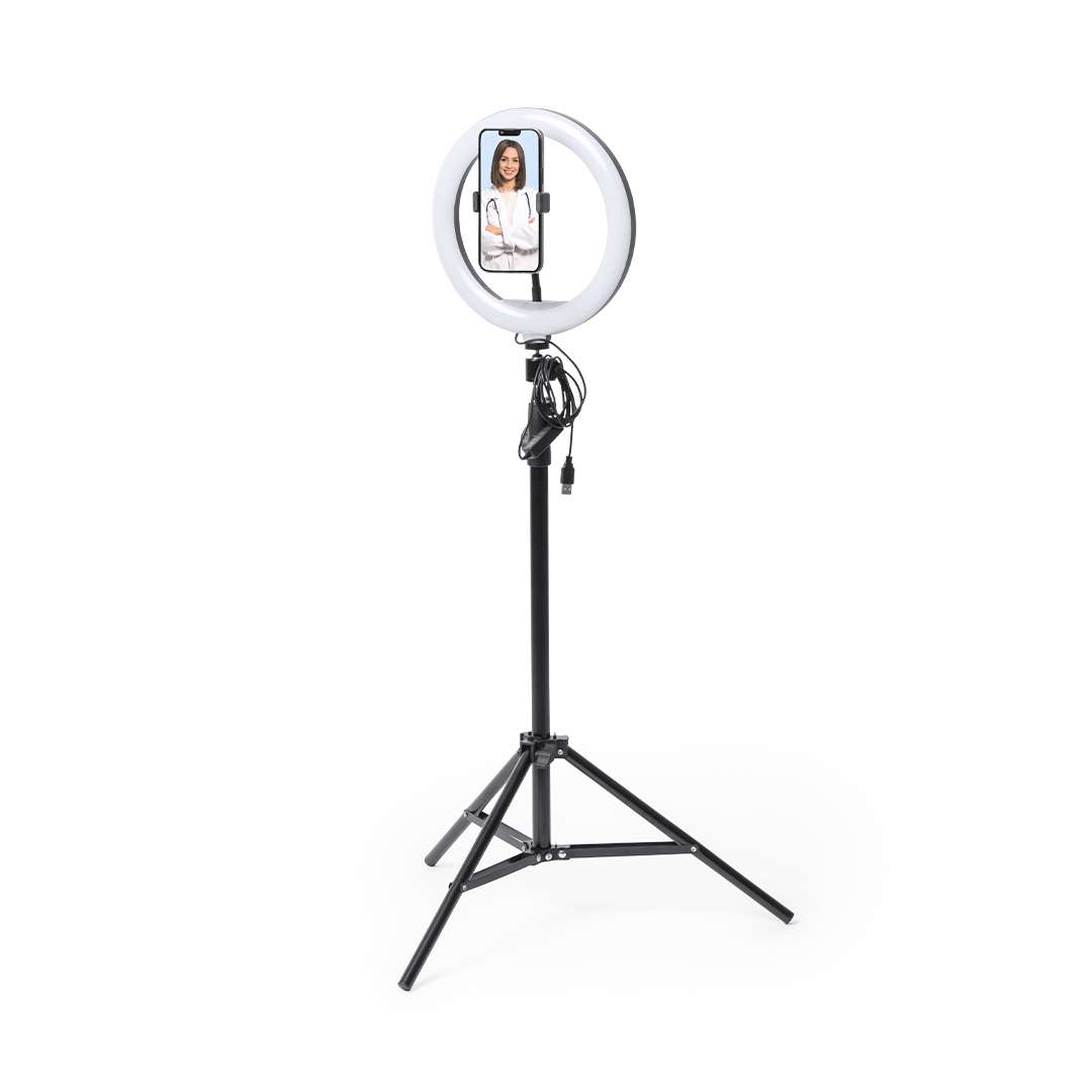 Set di luci. Include anello luminoso, treppiede da tavolo e treppiede da terra con altezza regolabile fino a 180 cm. 120 LED, con 3 posizioni di illuminazione e 10 livelli di intensità luminosa regolabili. Alimentato dalla connessione USB. Cavo con controller e telecomando incluso. Confezionato in una scatola dal design accattivante.