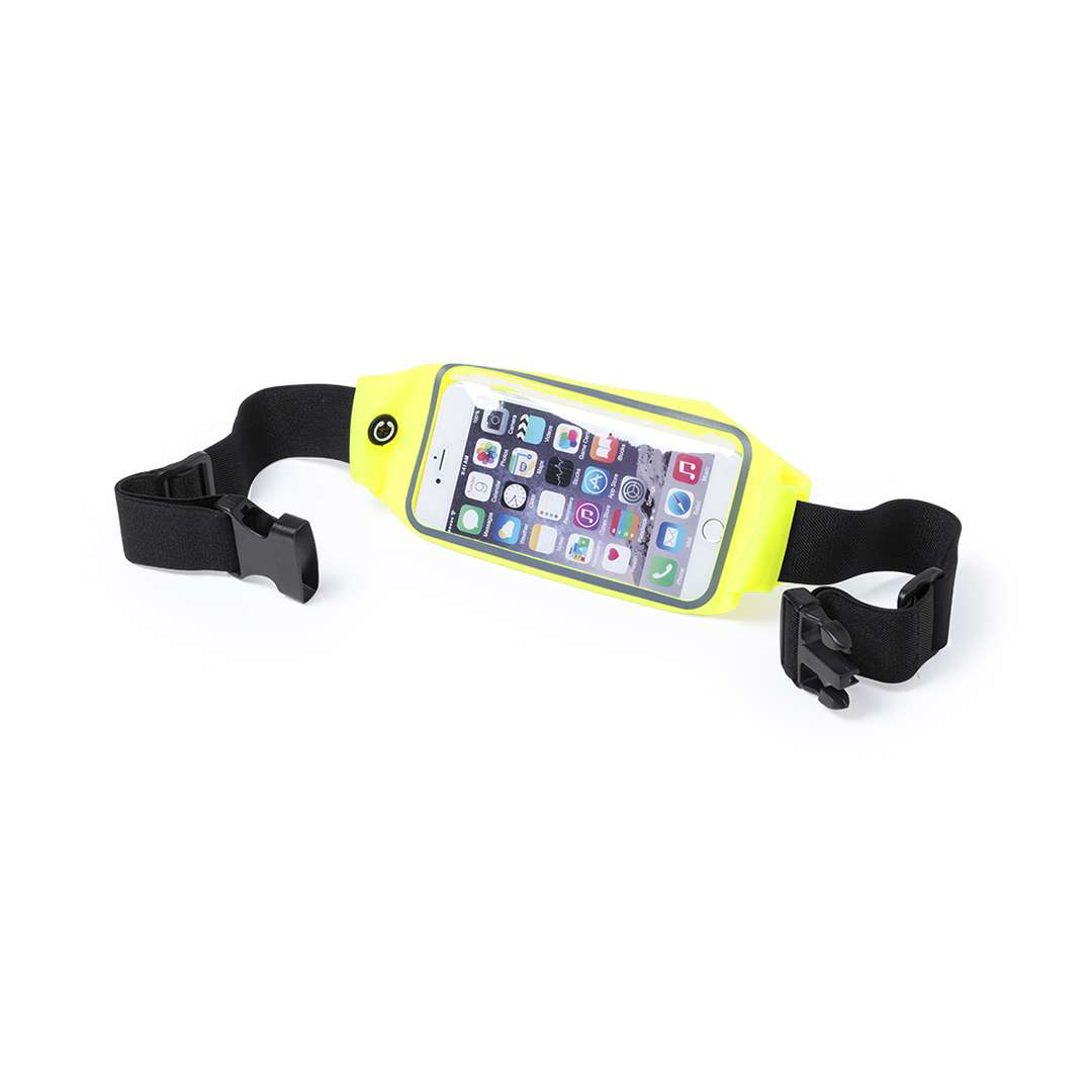 Marsupio di alta qualità, resistente agli spruzzi d'acqua, realizzato in lycra in vari colori. Tasca principale in PVC resistente con funzione touch. Progettato per lo sport e il tempo libero. Con tasca con zip in tinta, uscita per le cuffie ed elastico in vita con chiusura a scatto regolabile.
