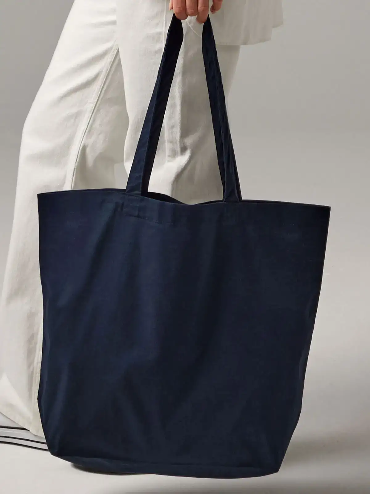 100% cotone. Shopper ampia, può essere portata a mano o in spalla. Lunghezza manico: 58 cm. Dimensioni: cm 35x39x13,5. Capacita' 18 Lt. Area di stampa cm 25X38