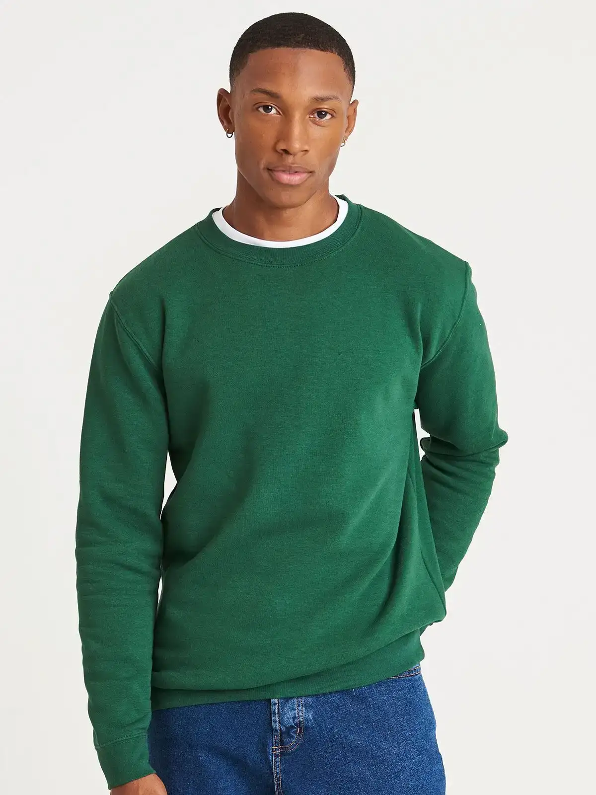 80% cotone organico, 20% poliestere riciclato. Felpa girocollo con maniche set-in, nastro di rinforzo sul collo, cuciture doppie, orlo e polsini a costine, felpata internamente, etichetta strappabile. (Col. HGR: 75% cot. 15% pol.)