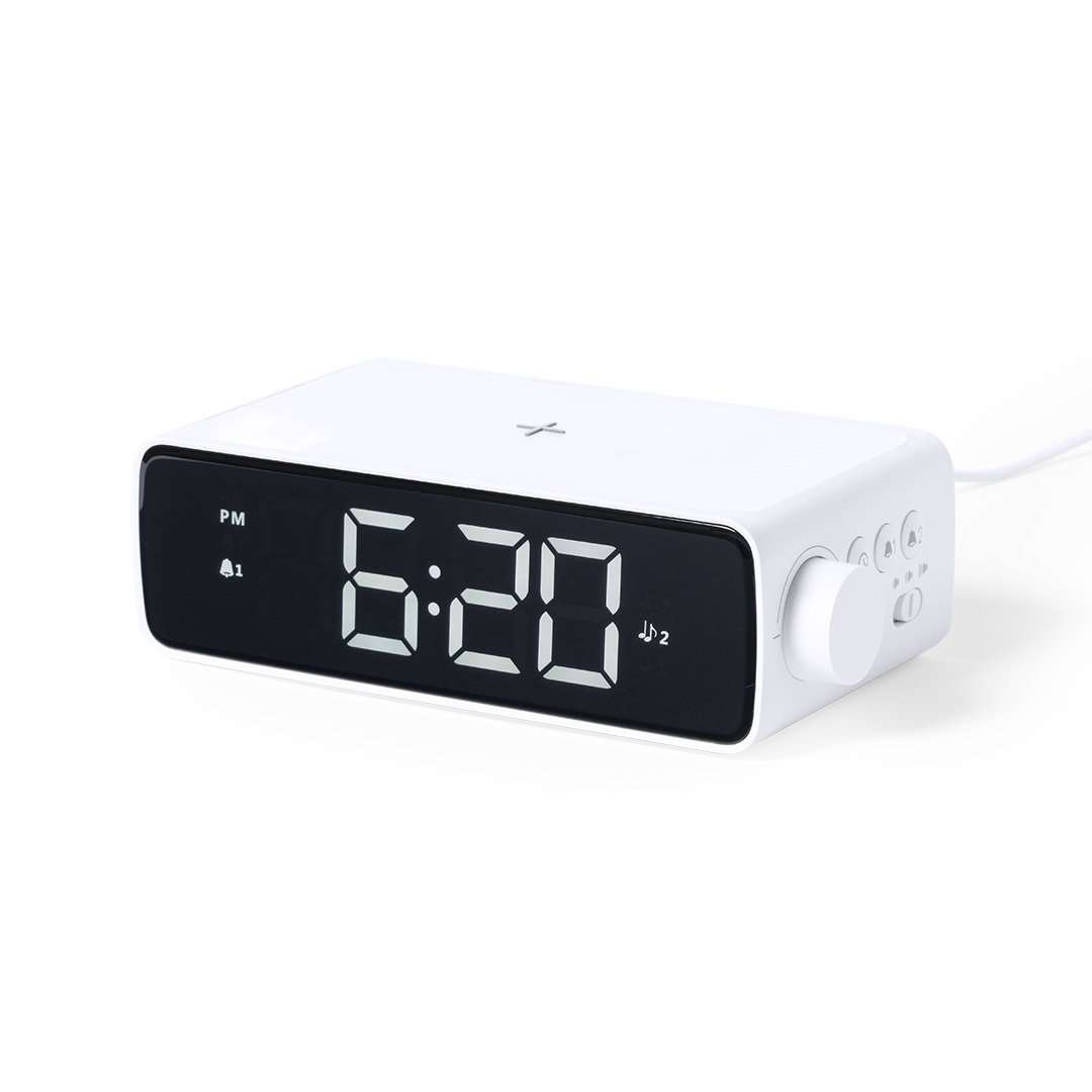 Orologio multifunzionale dall'elegante design, bianco, con caricatore wireless 10W integrato e lampada LED integrata. Con funzione data/ora, allarme e 36 lampada LED con intensità luminosa regolabile. Connessione USB, incluso cavo di tipo C da 100 cm e alimentazione ausiliaria con batterie a bottone (incluse). Compatibile con i dispositivi dotati di tecnologia di ricarica wireless. Confezionato in una scatola dal design accattivante. Conforme ai requisiti di sicurezza:Sistema di protezione dal surriscaldamento.Sistema di protezione da sovraccarico".