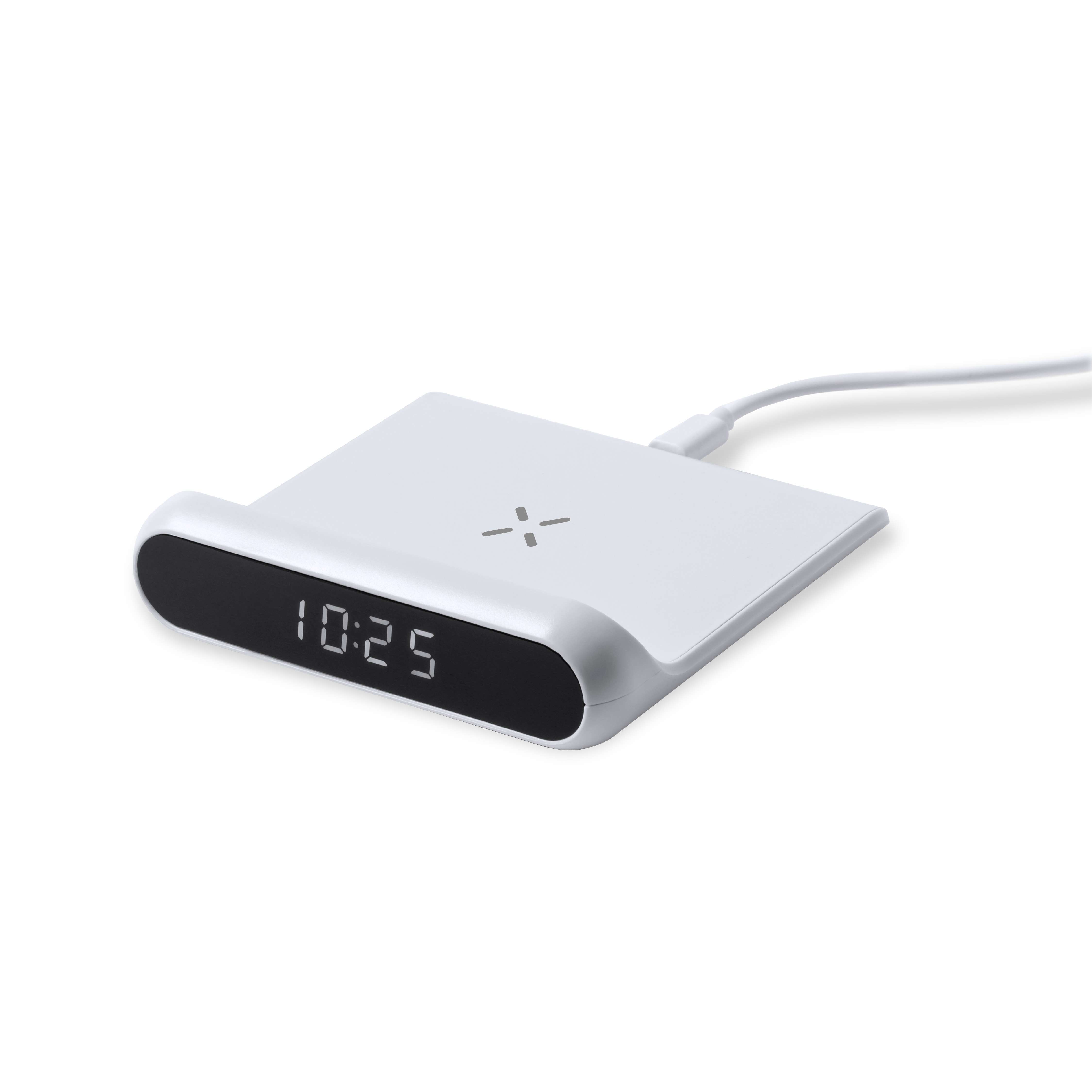 Orologio multifunzione con display retroilluminato e caricatore wireless integrato da 10W. Elegante design bianco con funzioni di ora e sveglia. Cavo di ricarica di tipo C da 1 m incluso e compatibile con i dispositivi dotati di tecnologia di ricarica wireless Qi. Confezionato singolarmente in una scatola kraft di design, con manuale di istruzioni in inglese e spagnolo.Prodotto secondo gli standard RoHS e in conformità ai seguenti requisiti di sicurezza:Sistema di protezione dal surriscaldamento.Sistema di protezione da sovraccarico.Sistema di bloccaggio per evitare cortocircuiti.