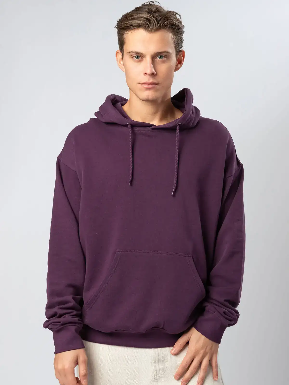 100% cotone. Felpa genderless con cappuccio in french terry, cotone pettinato a 3 fili, struttura con cuciture laterali, nastro di rinforzo nel colletto, cappuccio a doppio strato, occhielli in metallo, cordini tono su tono, grande tasca a marsupio, fascia in vita e polsini in costina. Etichetta strappabile. Composizione Grey Heather: 93%Cot 7%Pol.