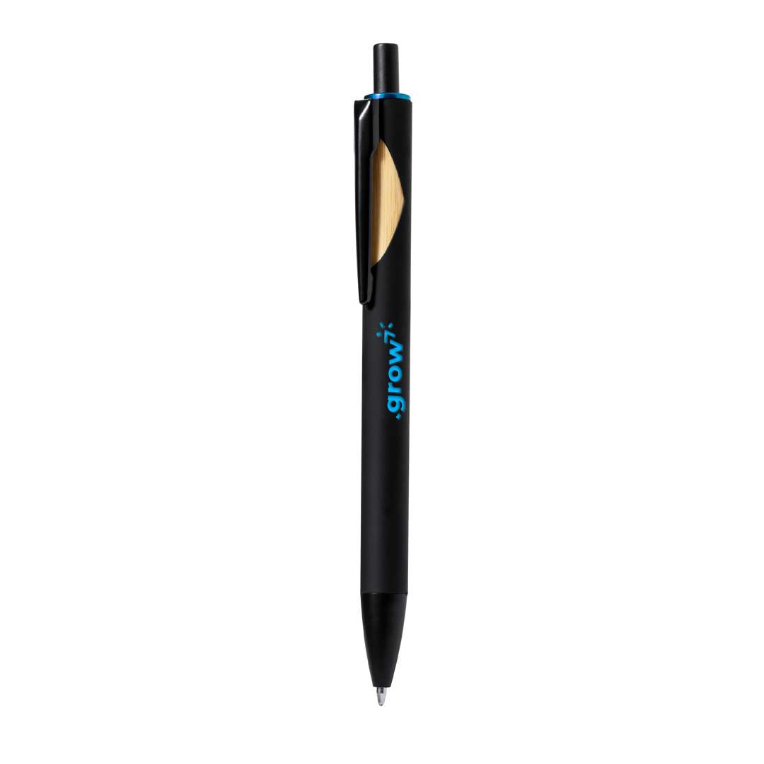 Penna con meccanismo a pulsante con fusto in finitura nera solida e dettagli della parte superiore in vari colori. Clip in metallo nero con dettaglio in bambù. Appositamente progettata per la stampa laser e dotata di uno speciale rivestimento esterno che consente di incidere in modo perfettamente coordinato la vostra pubblicità. In inchiostro blu. Presentato in un sacchetto individuale riciclato.Materiali come il bambù favoriscono l'utilizzo di materie prime naturali, riducendo le emissioni inquinanti. Proviene da una pianta altamente resistente e versatile, con una rapida crescita e rigenerazione, che lo rende un'ottima alternativa all'uso del legno tradizionale.