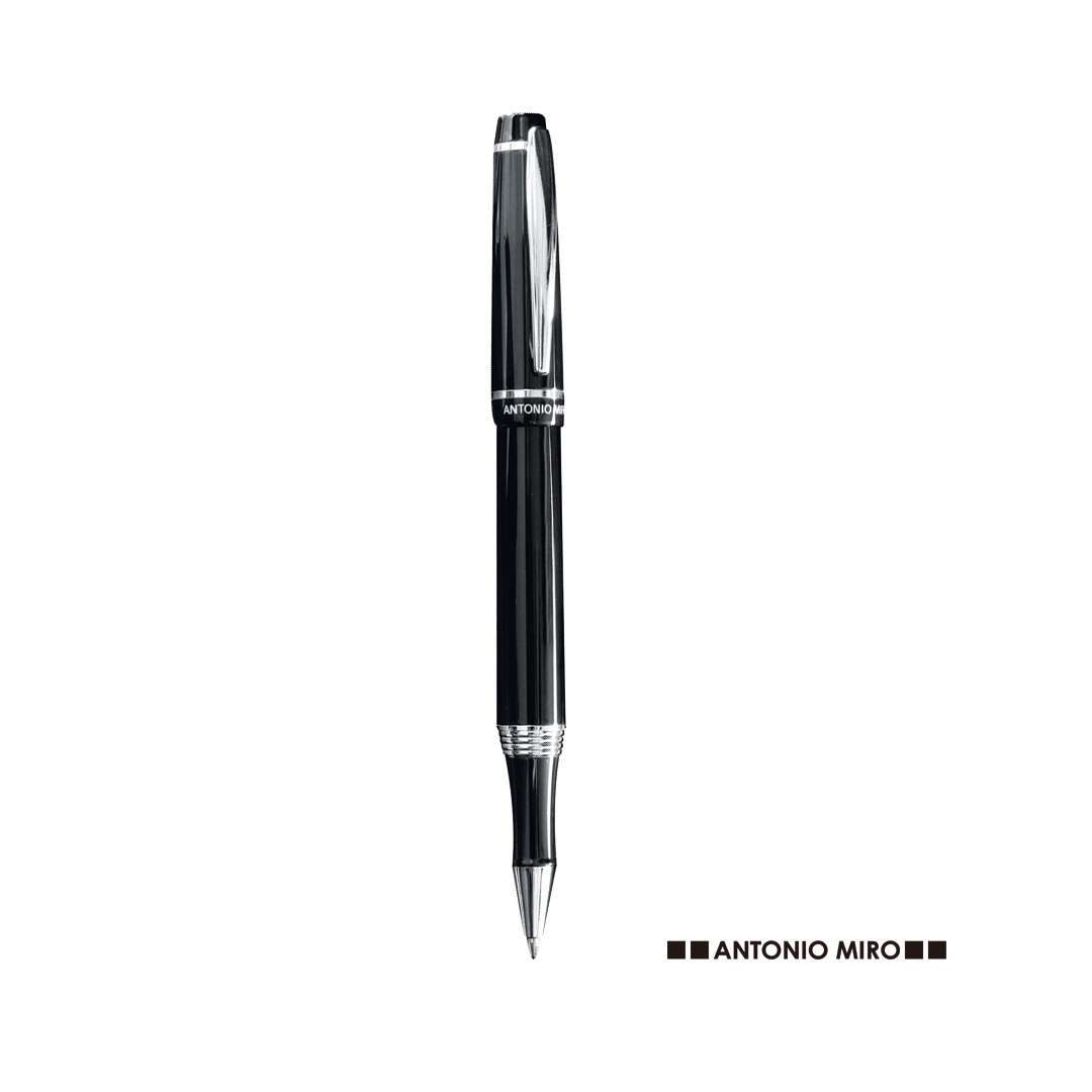 Penna roller by Antonio Miró con cappuccio dall'elegante design bicolore e fusto metallico liscio in sobrio nero. Con logo del marchio sotto l'anello, clip e punta in finitura argento lucido. Presentata in un astuccio nero individuale con logo del marchio. In inchiostro blu.