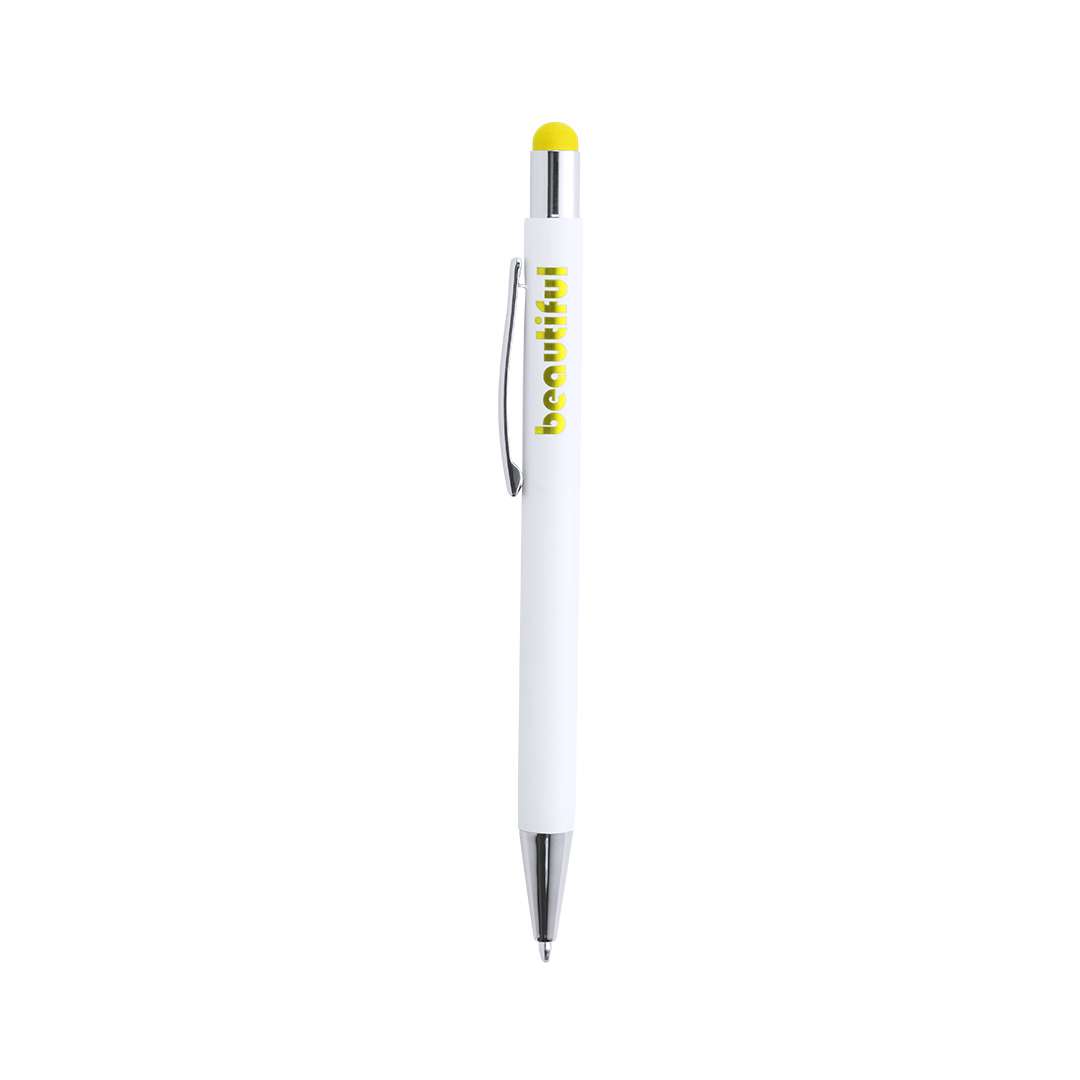 Penna touch con meccanismo a pulsante ed elegante fusto in alluminio bianco opaco. Puntatore in una gamma di colori che si abbinano al colore dell'interno e con elementi cromati. Rivestimento esterno appositamente studiato per l'incisione laser, per garantire un'incisione perfetta della vostra pubblicità o del vostro marchio in tinta con l'interno. Con cartuccia jumbo e inchiostro blu.