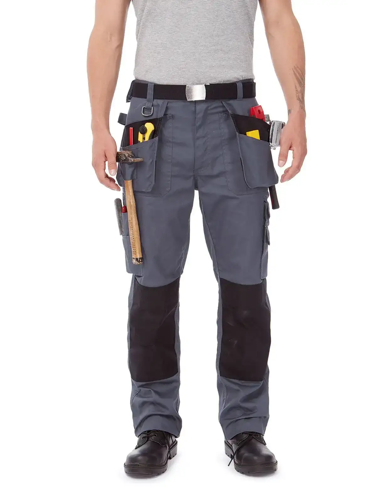 65% poliestere, 35% cotone Twill. Pantaloni con tasche porta ginocchiere, tasche volanti che si possono inserire in tasche più profonde se non utilizzate, girovita posteriore con elastico, anello per portachiavi e altri oggetti, occhiello porta martello su entrambi i lati. Sistema in velcro per inserimento rapido di tasche porta oggetti. Cuciture triple rinforzate, resistenti ad abrasione e strappo.