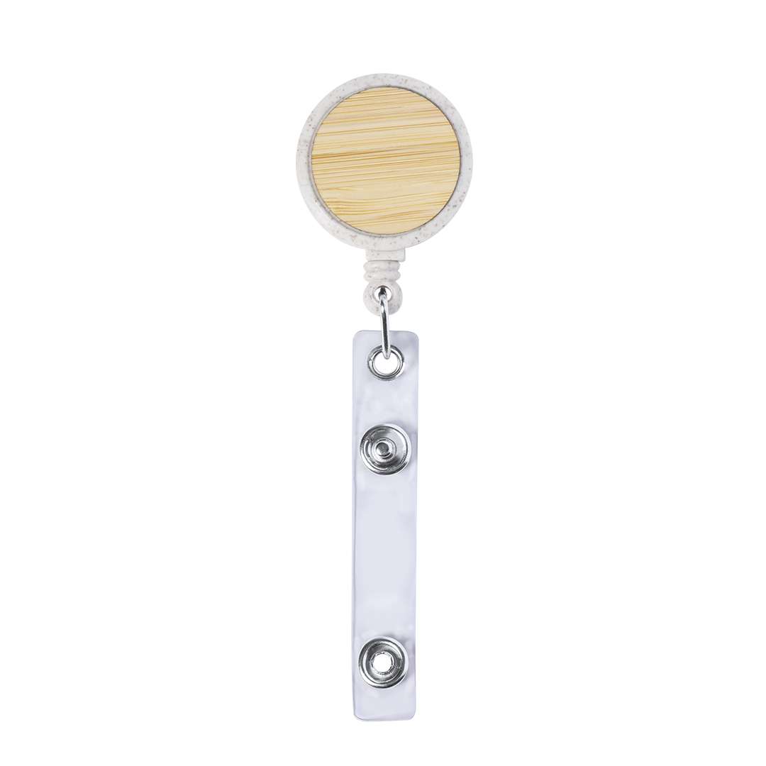 Portabadge estensibile in bambù e fibra di grano. Con cinghia di chiusura a bottone e meccanismo estensibile fino a 70 cm. Include una clip posteriore in metallo per il fissaggio. Con ampia superficie di stampa sulla parte centrale in bambù. Confezionato singolarmente in un sacchetto riciclato. Materiali come il bambù favoriscono l'uso di materie prime naturali, riducendo le emissioni inquinanti. Proviene da una pianta altamente resistente e versatile, con una crescita e una rigenerazione rapida, rappresentando un'ottima alternativa all'uso del legno tradizionale