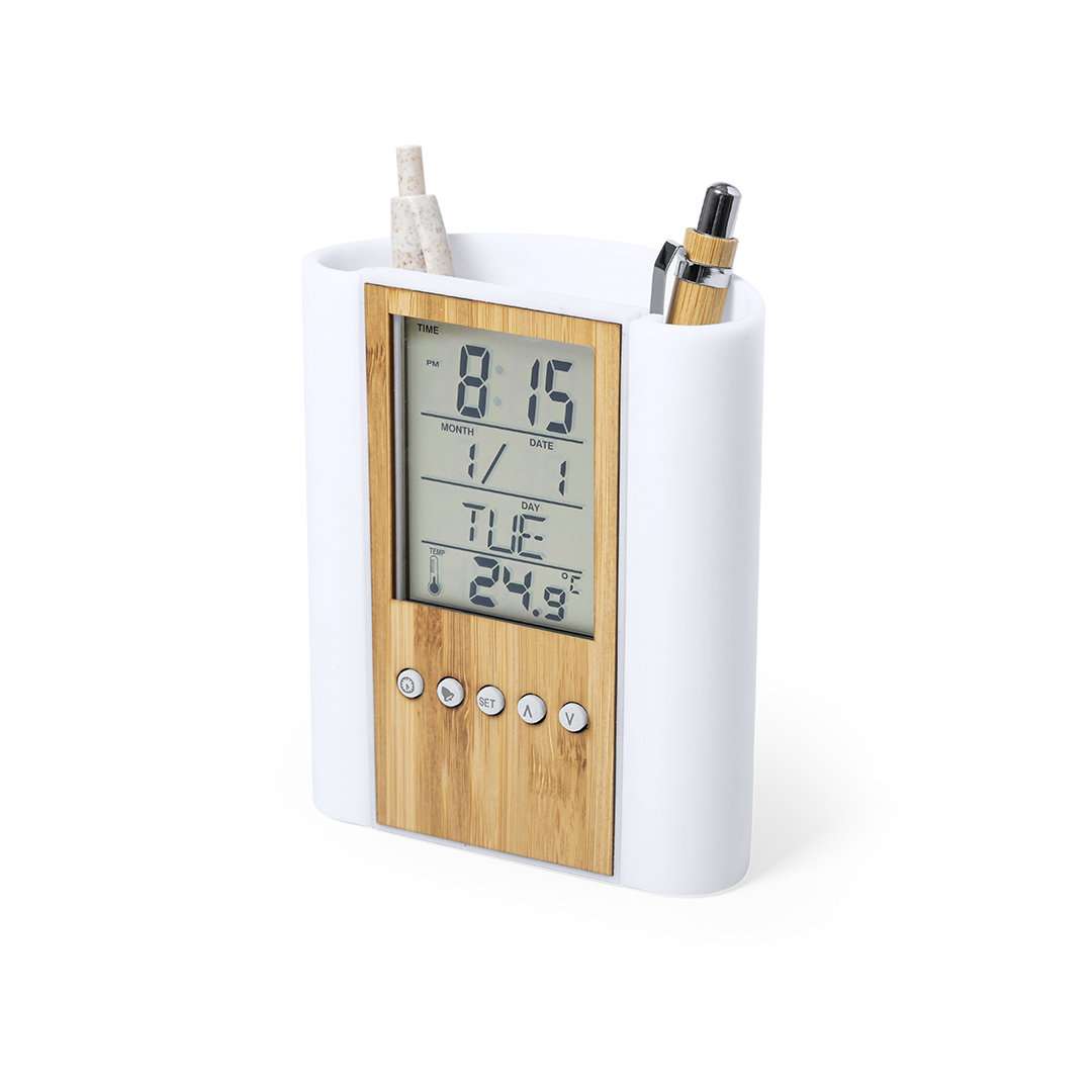 Porta penne della linea Nature con orologio multifunzione integrato. Realizzato con una combinazione di bambù e ABS. Funzioni di termometro, calendario e sveglia timer e promemoria per il compleanno. Alimentato a batteria (a bottone inclusa) e confezionato in un'attraente scatola dal design ecologico. Manuale di istruzioni disponibile in spagnolo e inglese