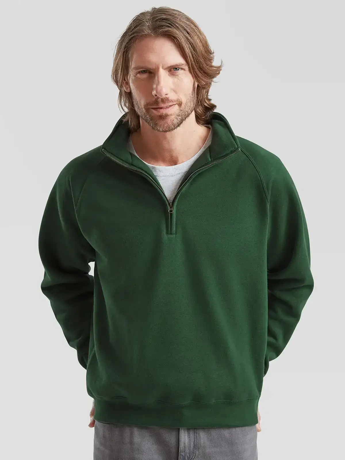 70% cotone, 30% poliestere. Felpa con maniche raglan, felpata internamente, zip ¼, struttura con cuciture laterali. Etichetta removibile. (Col. 30/94: 260 g/m²).