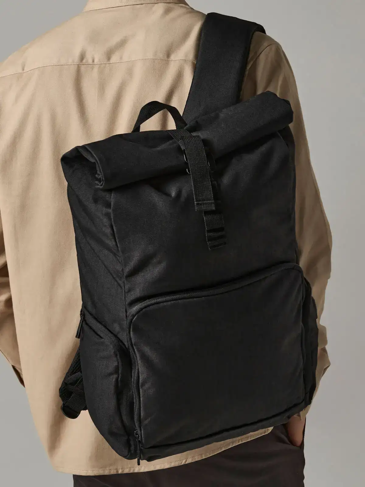 100% 650D poliestere. Zaino per laptop fino a 15.6", chiusura con roll-top e clip, tasca nascosta con cerniera nel pannello posteriore, tasche interne, porta per ricarica USB, tasca frontale e tasche laterali con zip. Dimensioni: 31x45x17 cm, capacità: 22 litri, area stampabile: 23x24 cm.