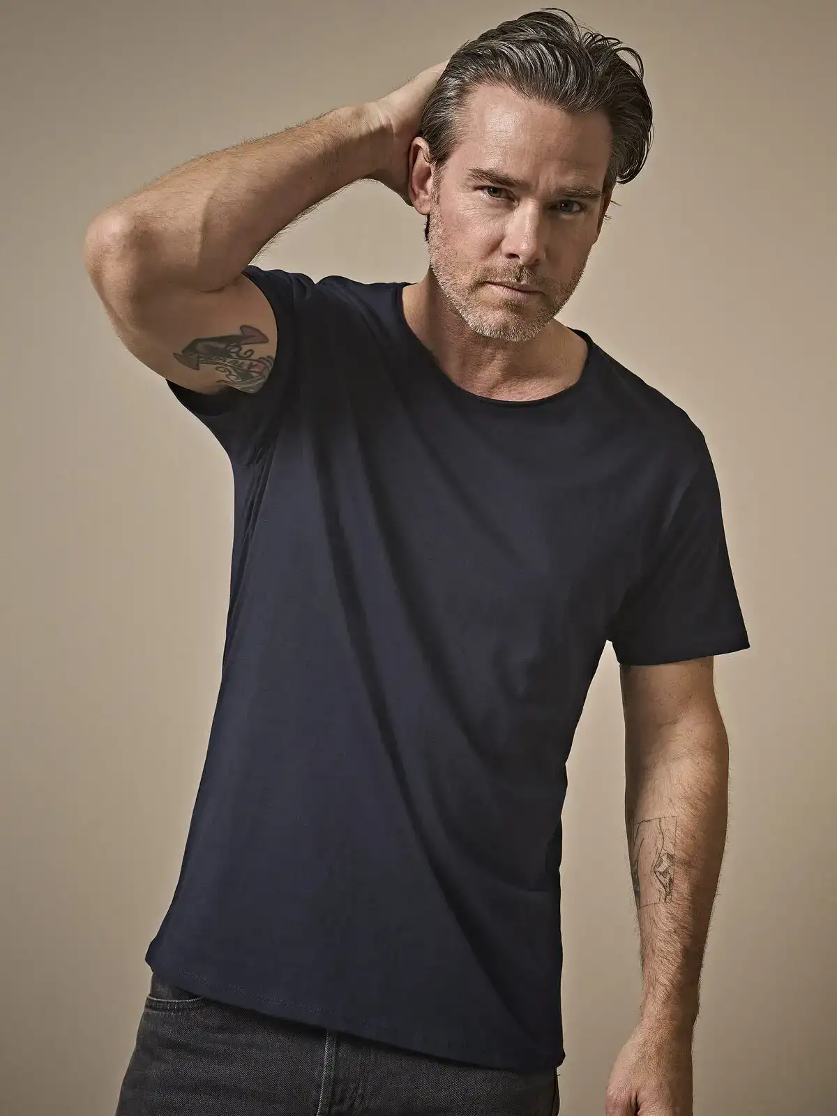 100% cotone single jersey, pettinato ringspun. T-shirt dalla vestibilità moderna, ampio scollo con bordo a taglio vivo, nastro di rinforzo alle spalle. Cuciture laterali.
