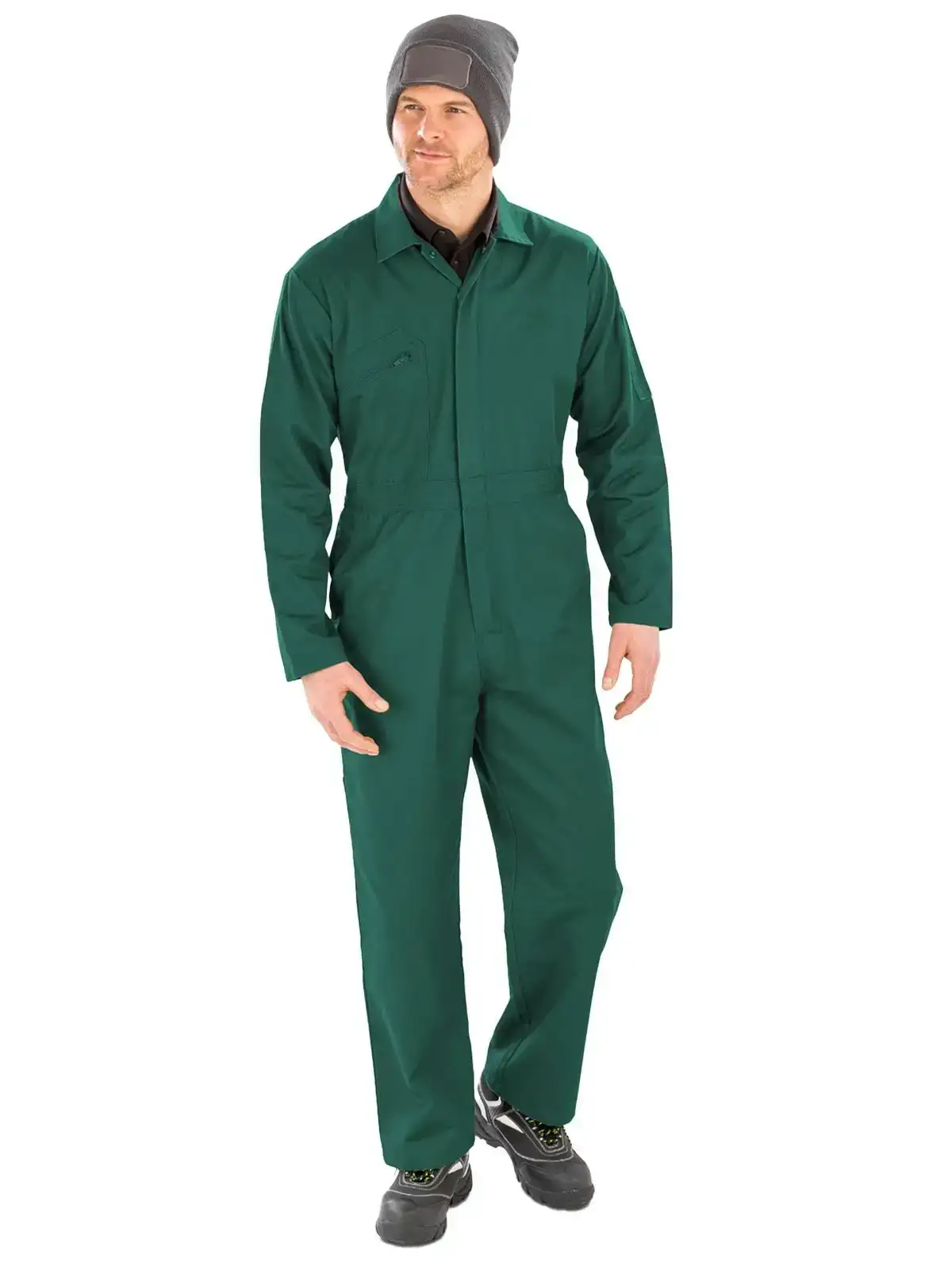 100% poliestere twill riciclato. 270 g/m². Salopette robusta e pratica, con numerose tasche e schiena elasticizzata, senza fodera. Zip bidirezionale YKK con patta di protezione, tasche laterali, tasche posteriori con zip. Cintura elasticizzata sul retro, polsini e caviglie aperti. Schiena con soffietto, colletto con bottone automatico. Taschino porta-penna sulla manica, tasca sul petto con zip, tasca per righello. Prodotta da bottiglie in 100% plastica riciclata PET post-consumo.