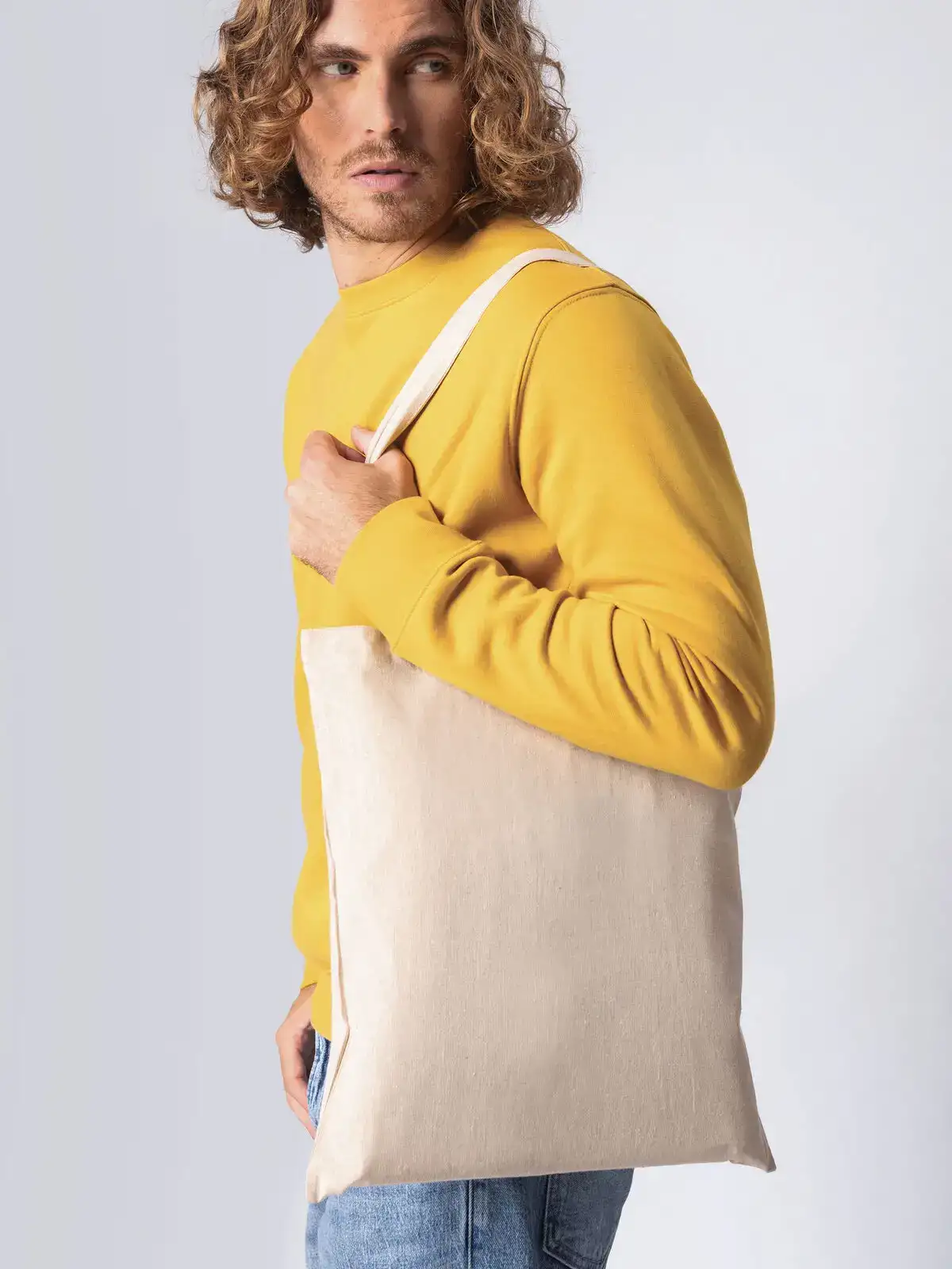 Cotone riciclato. Shopper ecosostenibile in cotone riciclato, manico lungo 67 cm, prodotto stirato per una migliore stampabilità. Etichetta removibile. Dimensione: 38 x 42 cm. Area stampabile: 26 x 30 cm.